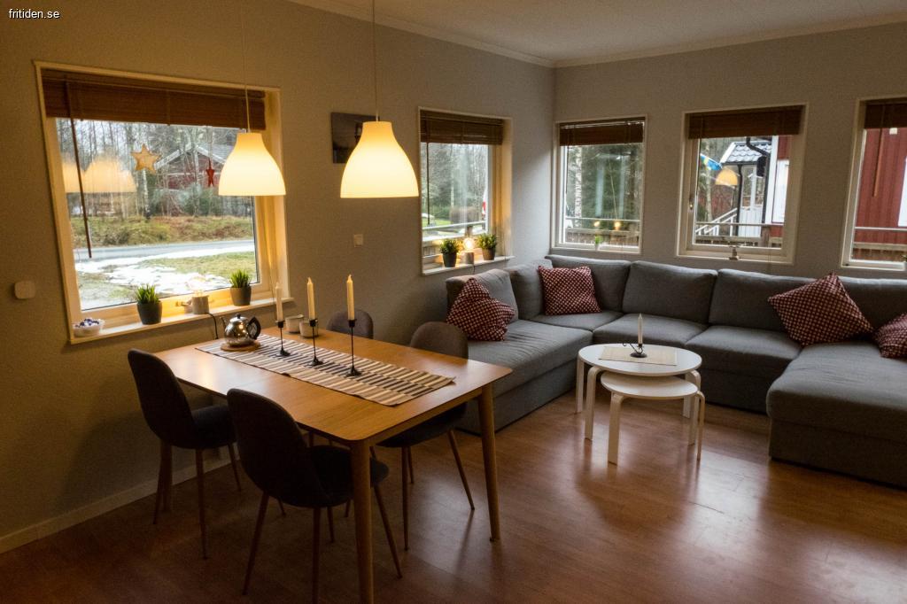 Entré med liten hall. Intill hallen ligger det välutrustade köket med öppen planlösning mot matplatsen. Denna ligger öppen mot vardagsrummet med en centralt placerad eldstad synlig från både matplatsen och soffgruppen med TV. Därifrån finns utgång till solig altan för att ta en fin frukost