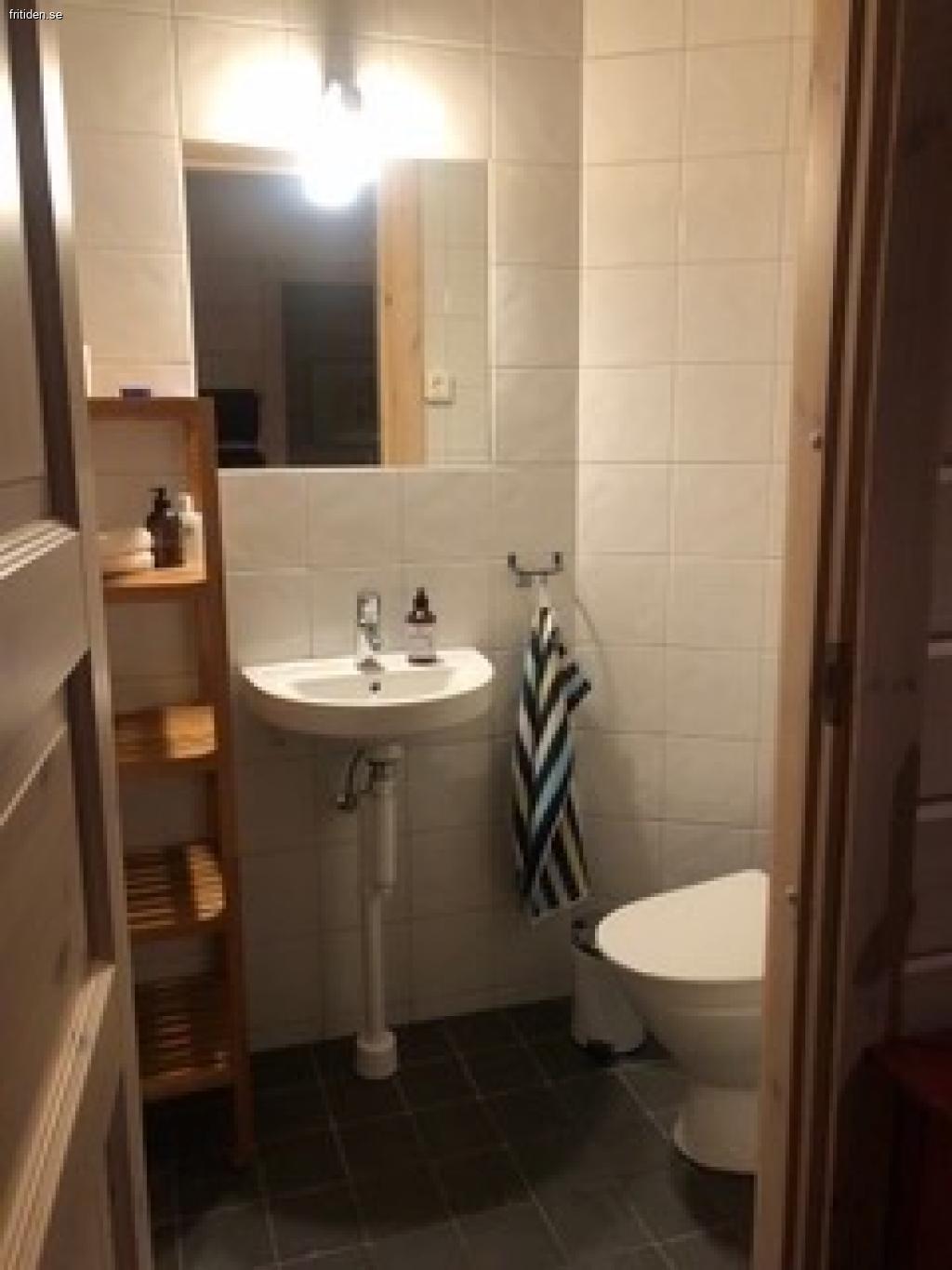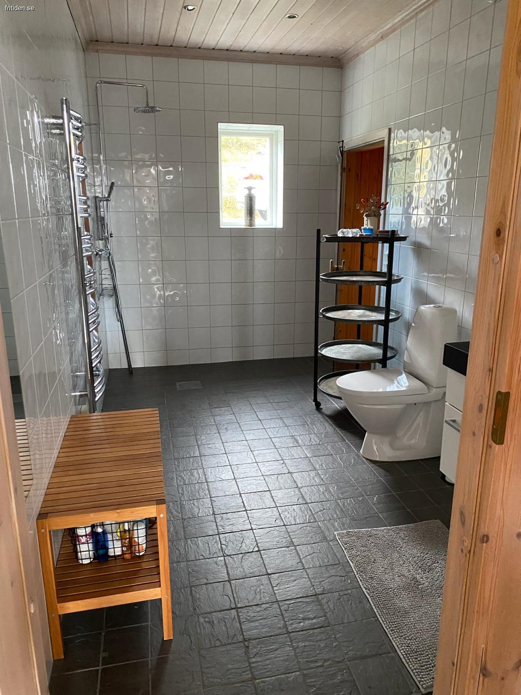 Huset har ett rymligt badrum med dusch, bastu och toalett. Dessutom finns ett separat toalettrum i den rymliga hallen.