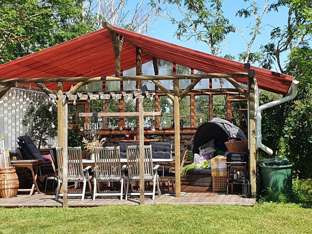 Dessutom ett stort friliggande, möblerat soldäck med tak, öppet mot söder i nv. hörnet av tomten.