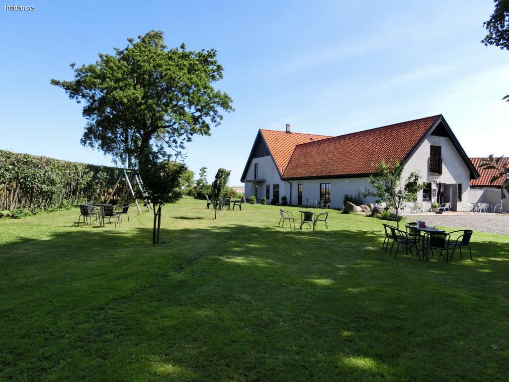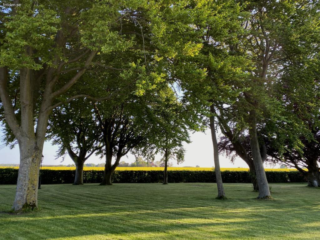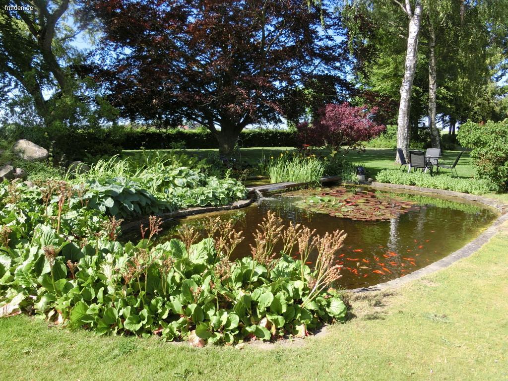 Det finns många sittgrupper att välja på i trädgården samt i den lilla parken. Damm med fiskar, vilken ej är inhägnad. Gung-/och klätterställning finns i trädgården.