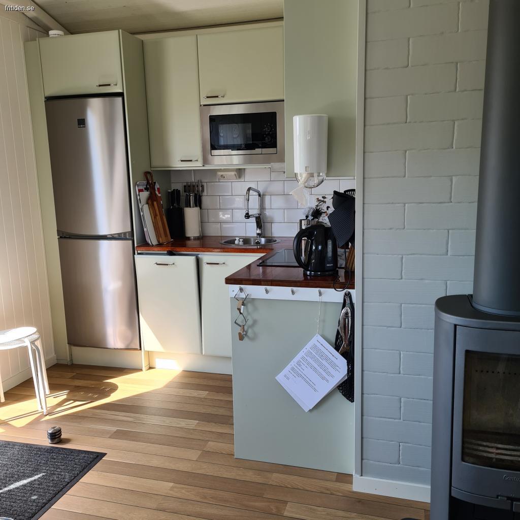 Kök och vardagsrum i öppen planlösning med högt i tak och braskamin. Mikro, ugn, glashäll, diskmaskin, kyl o frys, brödrost, vattenkokare, kaffebryggare samt husgeråd.