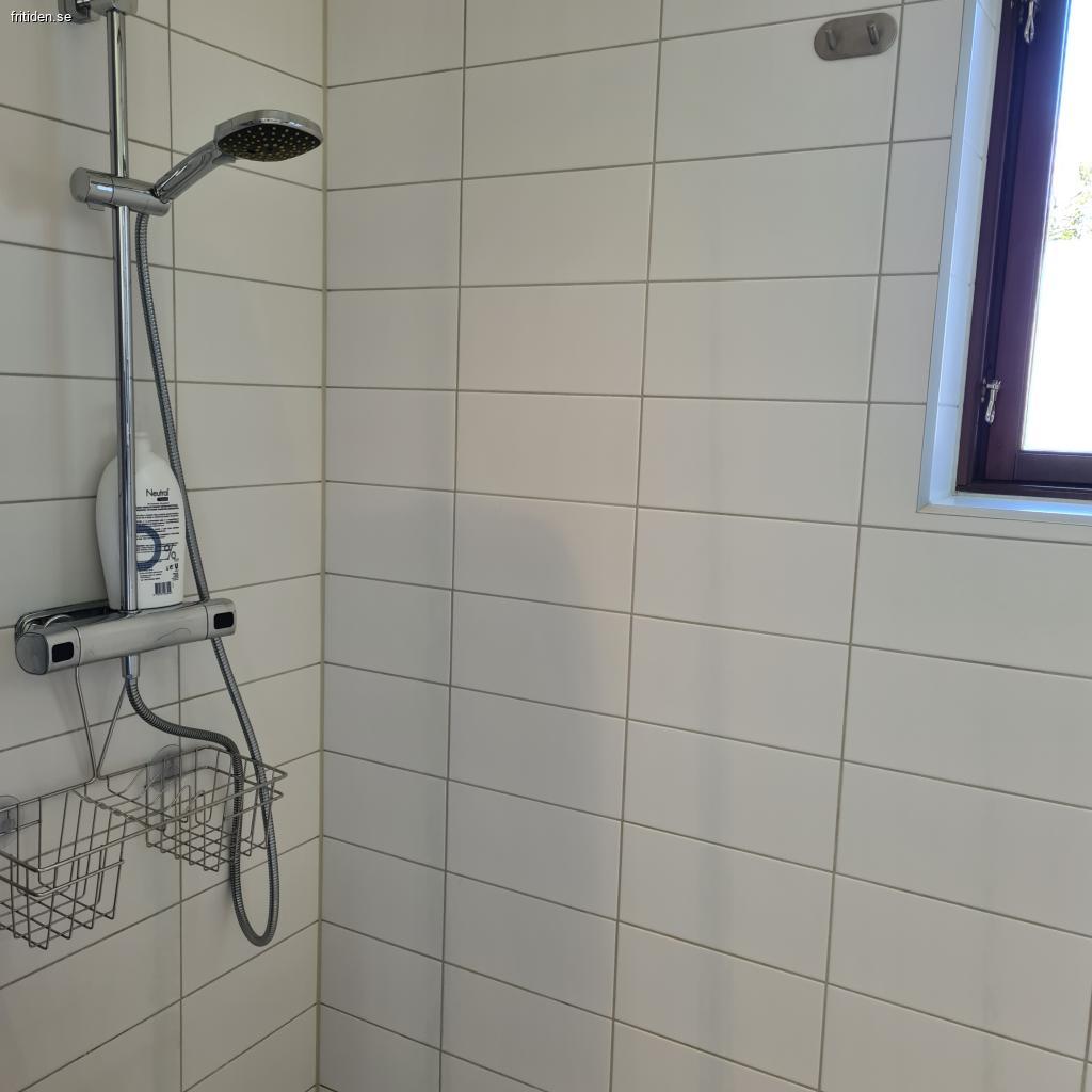 Badrum med dusch och tvättmaskin.