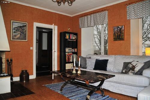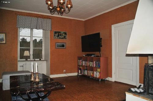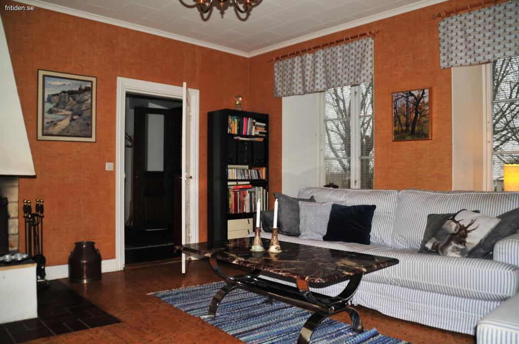 Allrummet rymmer soffgrupp och bord, tv och en braskamin. WiFi för internet.