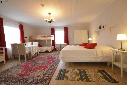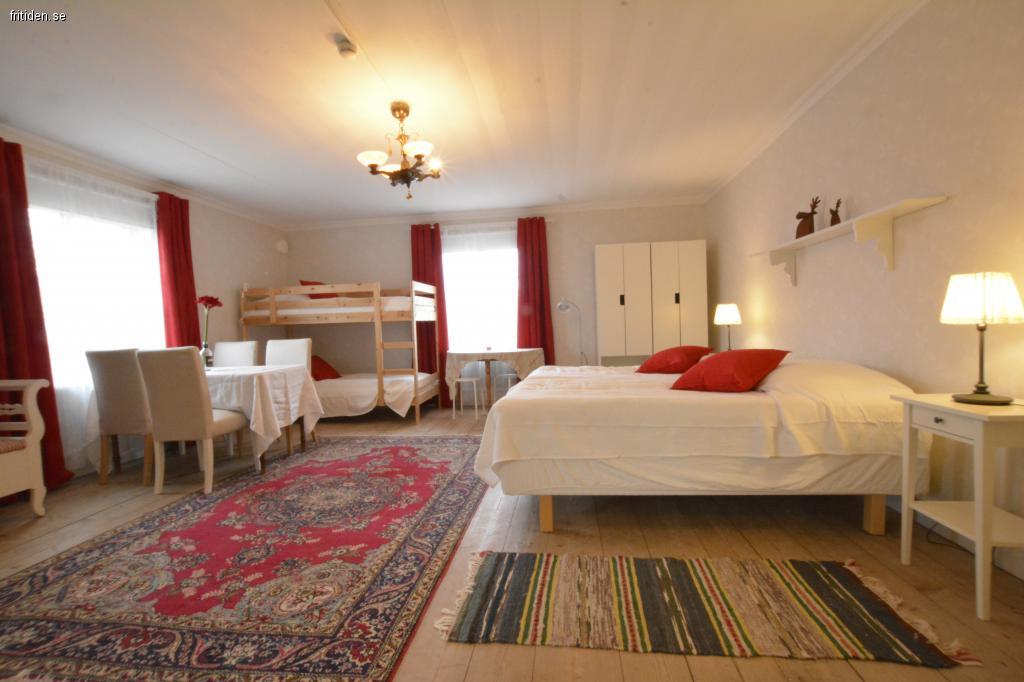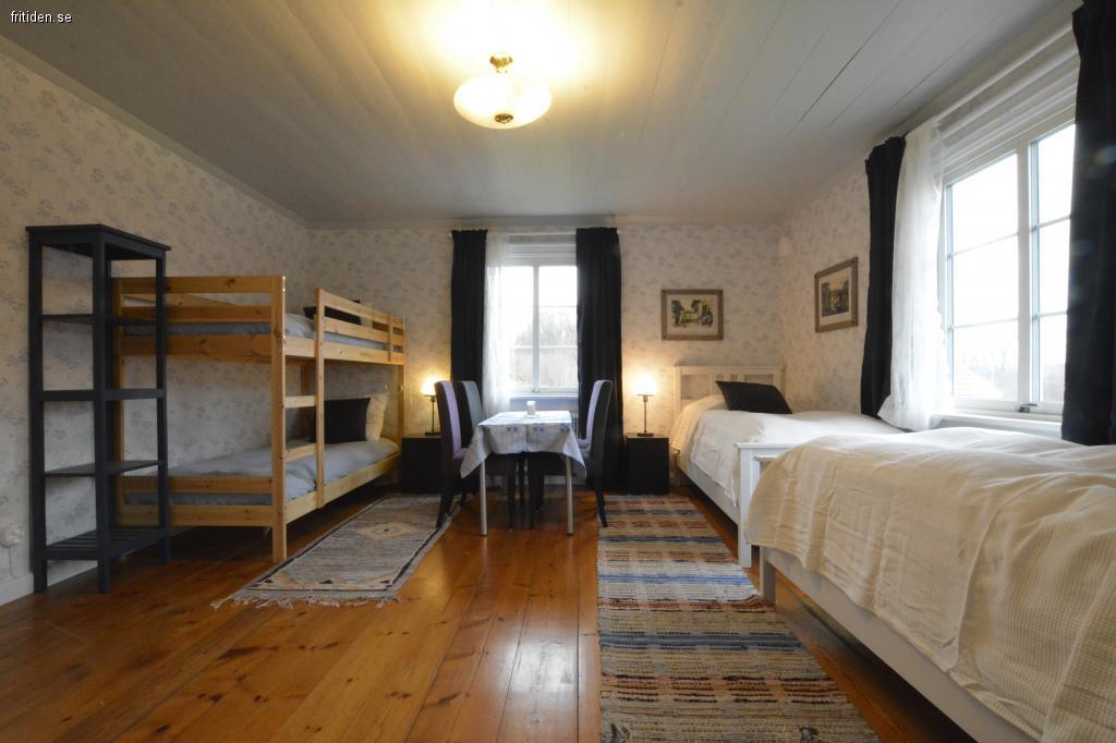 I denna Herrgårdsbyggnad bor ni mycket bra så många som upp till 16 personer! Det finns hela 6 sovrum; 4 stycken dubbelrum samt 2 stycken familjerum, alla med mycket bekväma sängar. De sängar som på bilderna ser ut som dubbelsängar är enkelsängar intill varandra. Dessa kan separeras något från varandra om ni föredrar detta. Vissa av sovrummen har en sittavdelning med stolar och bord. Samtliga 6 sovrum har sin privata wc och dusch med golvvärme. Gemensamt har ni sedan matsal, kök och TV-sal. Det finns dessutom en oerhört stor altan med tak, där det finns bekväma möbler. Altanen blir säkert den perfekta platsen för den sena sommarmiddagen, kräftskivan eller födelsedagskalaset.