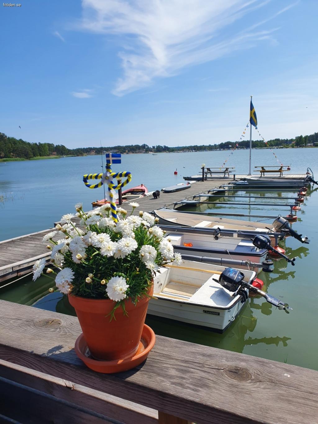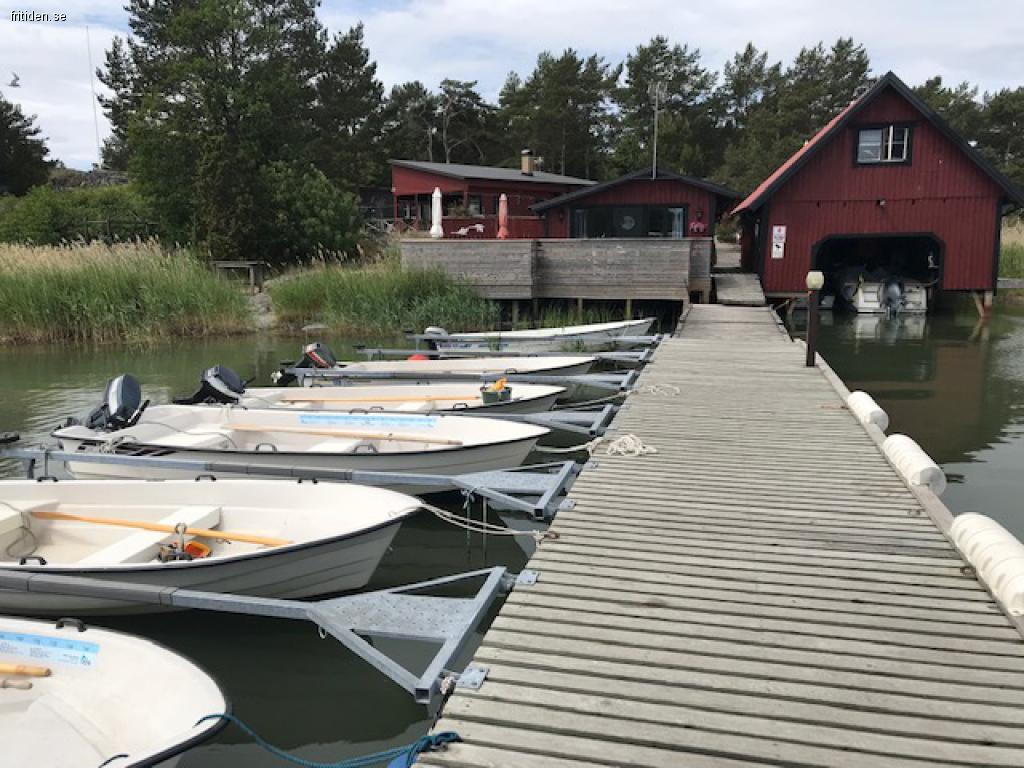 Gemensam brygga. Roddbåt ingår. 8 båtar med utombordare från 8-20 hk finns att hyra.
