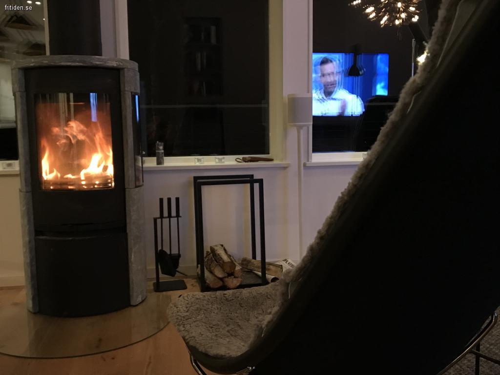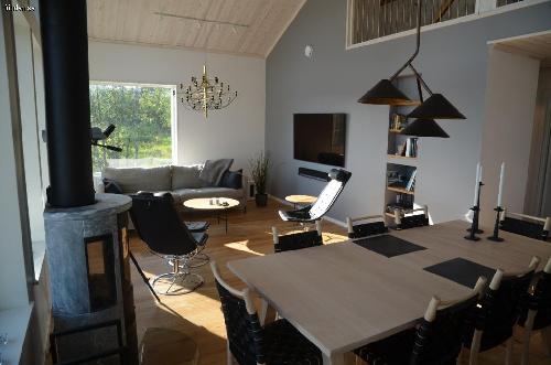 Huset har två duschar, två toaletter, bastu, tvättstuga, stort allrum med tak upp i nock, braskamin och 65 tum smart-TV Samsung med Sonos hemmabioystem, inbyggd Apple-TV och Android Chromecast. Köket är inrett med kyl, frys, induktionsspis, fläkt, mikro, diskmaskin, vinkyl, kaffebryggare, våffeljärn, brödrost etc. Köksö/bardisk samt separat stort matbord.