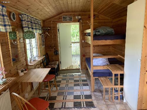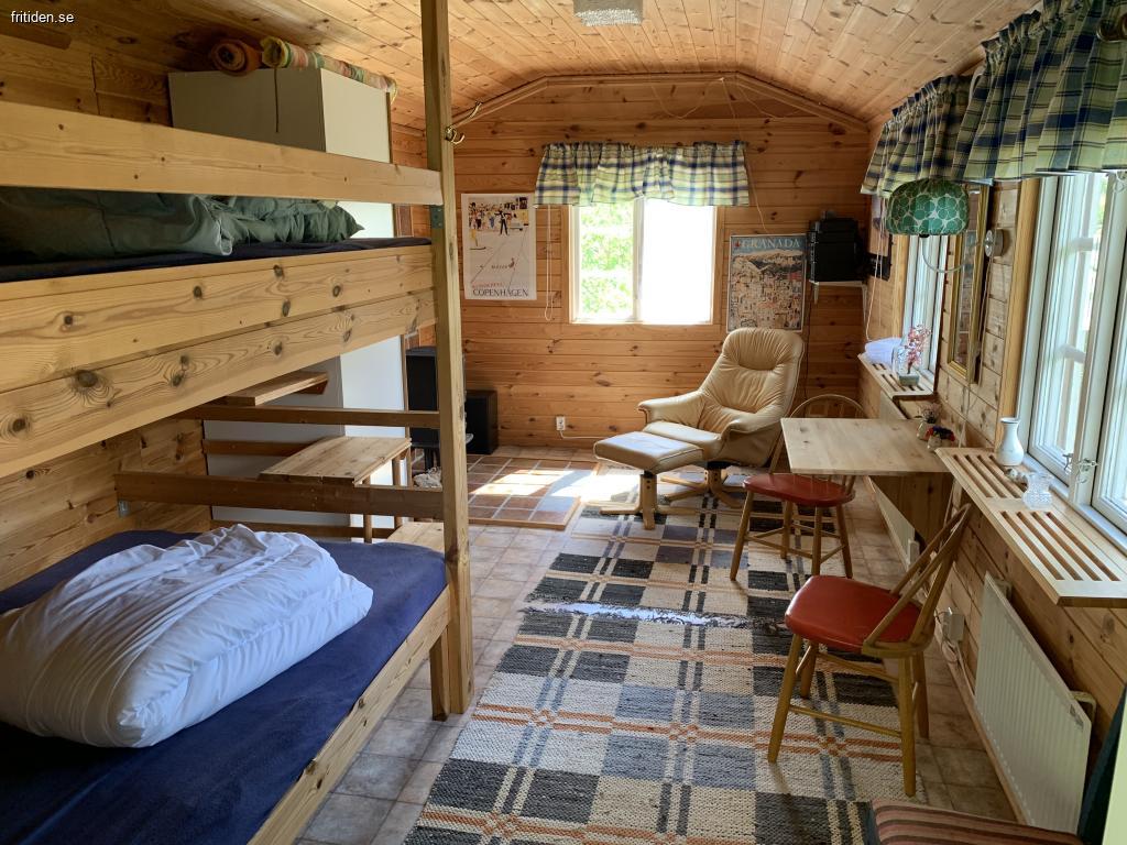 En gäststuga på 15 kvm för 2-4 personer, dvs. gedigna dubbelvåningsängar och en fåtölj och garderob. Här finns även utedass precis utanför på den sköna verandan.