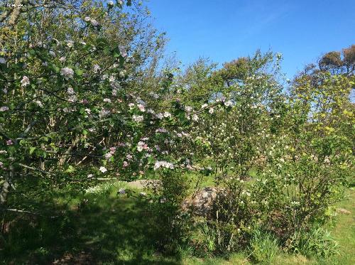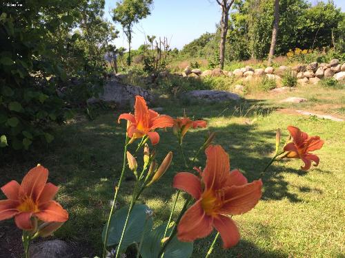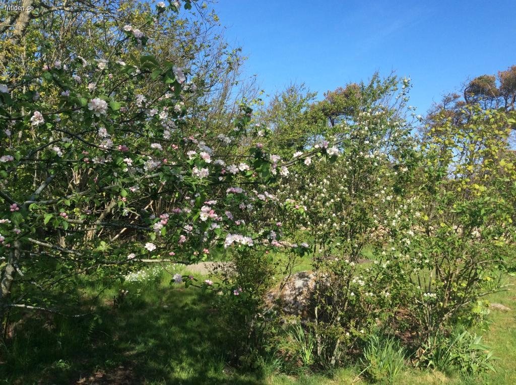 Den stora naturtomten har ett fritt och ogenerat läge vackert inramad av en klassisk stengärdsgård. På delar av tomten är det trädgård med små gräsmattor med plats för utemöbler. I trädgården växer bland annat vildapel, syren, jasmin, fläder, kaprifol, liljor och rosor.