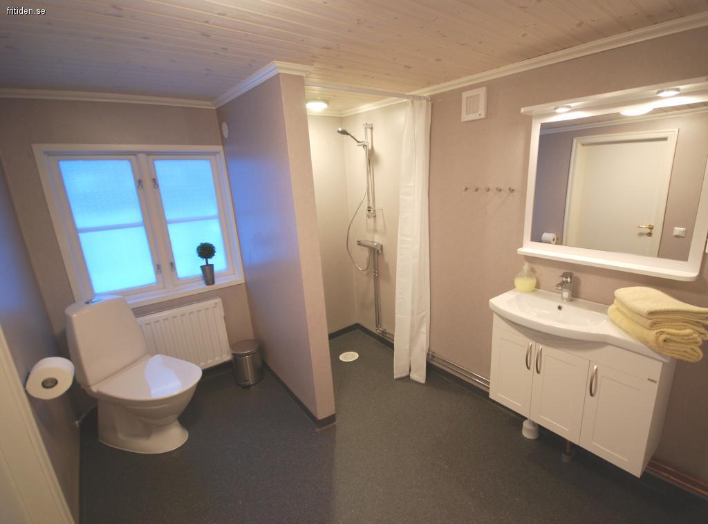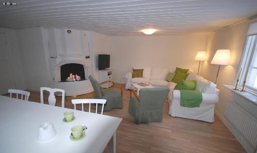 Nedervåningen består av ett 30 m² stort hemtrevligt vardagsrum med en mysig soffhörna. Här finns även en LCD smart-tv med gratis tillgång till Netflix liksom ett stort matbord m.m