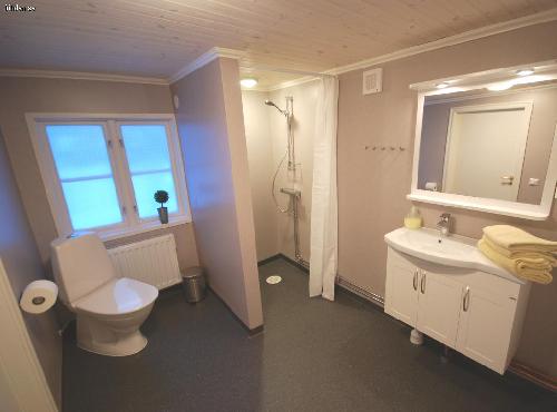 På samma våning finns även kök, ett av badrummen samt ett sovrum med två sängplatser utrustade med täcken och kuddar.