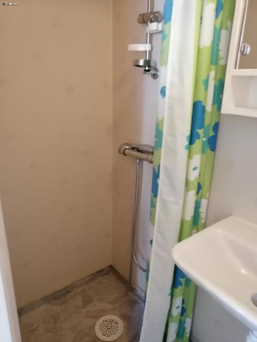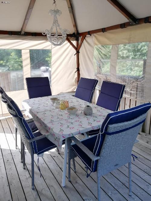 Stugan består av 2 sovrum, det ena med dubbelsäng det andra med 80 centimeters våningssäng. I allrummet finns bäddsoffa med 2 sovplatser, TV och köksdel med matbord, kyl/frys, hällspis med varmluftsugn, och mikrovågsugn. TV med både barn och sportkanaler (Allente). Vattentoalett med dusch och handfat. Altanen är ungefär lika stor som stugan och har paviljong med tak och väggar (ej med på bilden). Utemöbler med plats för 6 personer, solstolar et c. Kol- och elgrill finns också.