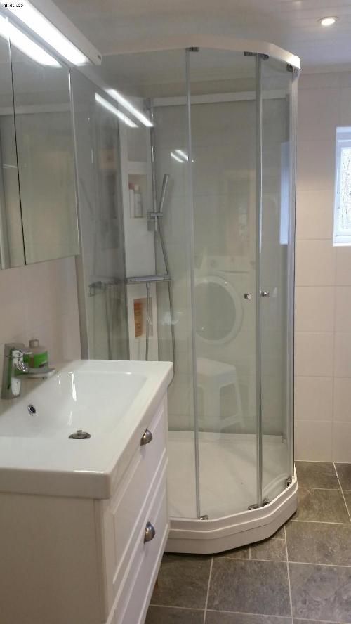 Badrummet har kaklade väggar och golv med golvvärme och innefattar handfat, dusch, toalett och en tvättmaskin med kombinerad torktumlare. Ljus och trevlig hall med ingång från verandan, där man ta kan sitta och dricka sitt morgonkaffe.