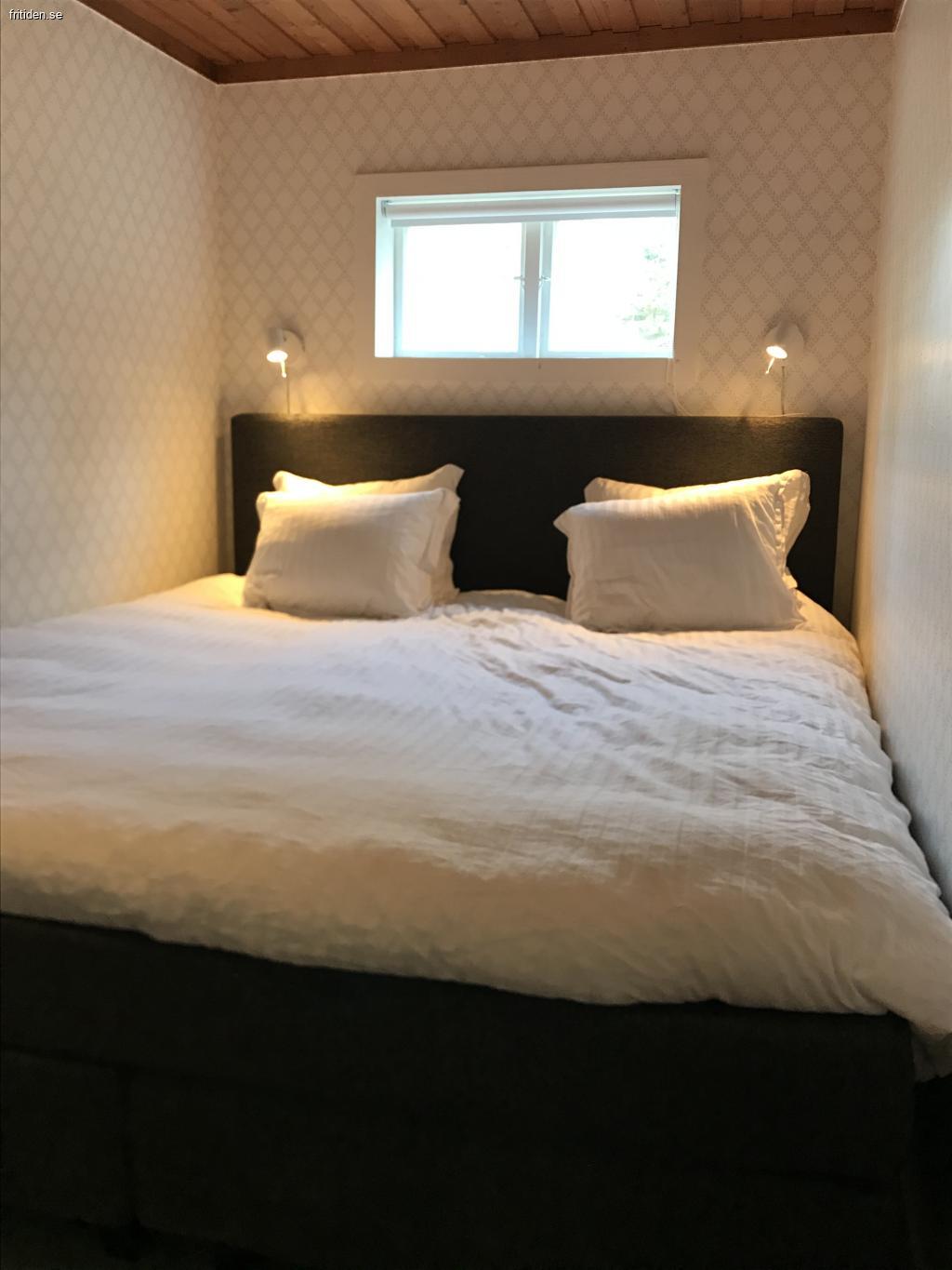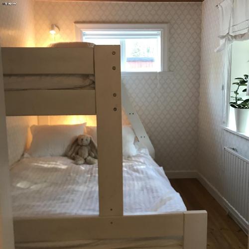 Huset har två separata sovrum. Det ena sovrummet har en bekväm dubbelsäng och det andra sovrummet har en våningssäng där den övre sängen är 80 cm bred och den nedre sängen är 120cm bred. Dessa två sängar har vi kompletterat med en 9 cm tjock bäddmadrass av latex för att göra sängarna bekväma även för äldre barn och vuxna att sova i. Täcken och kuddar i bra kvalité ingår och vill man kan man även få låna enhetliga påslakan (se sängbilder ovan) och handdukar i skön kvalite mot ett tillägg, kontakta hyresvärden. Barnsäng dvs resesäng med en tjock madrass inkl. täcke och kudde finns att låna. Det finns även en barnstol, en skötbädd och en barnservis i plast att tillgå.