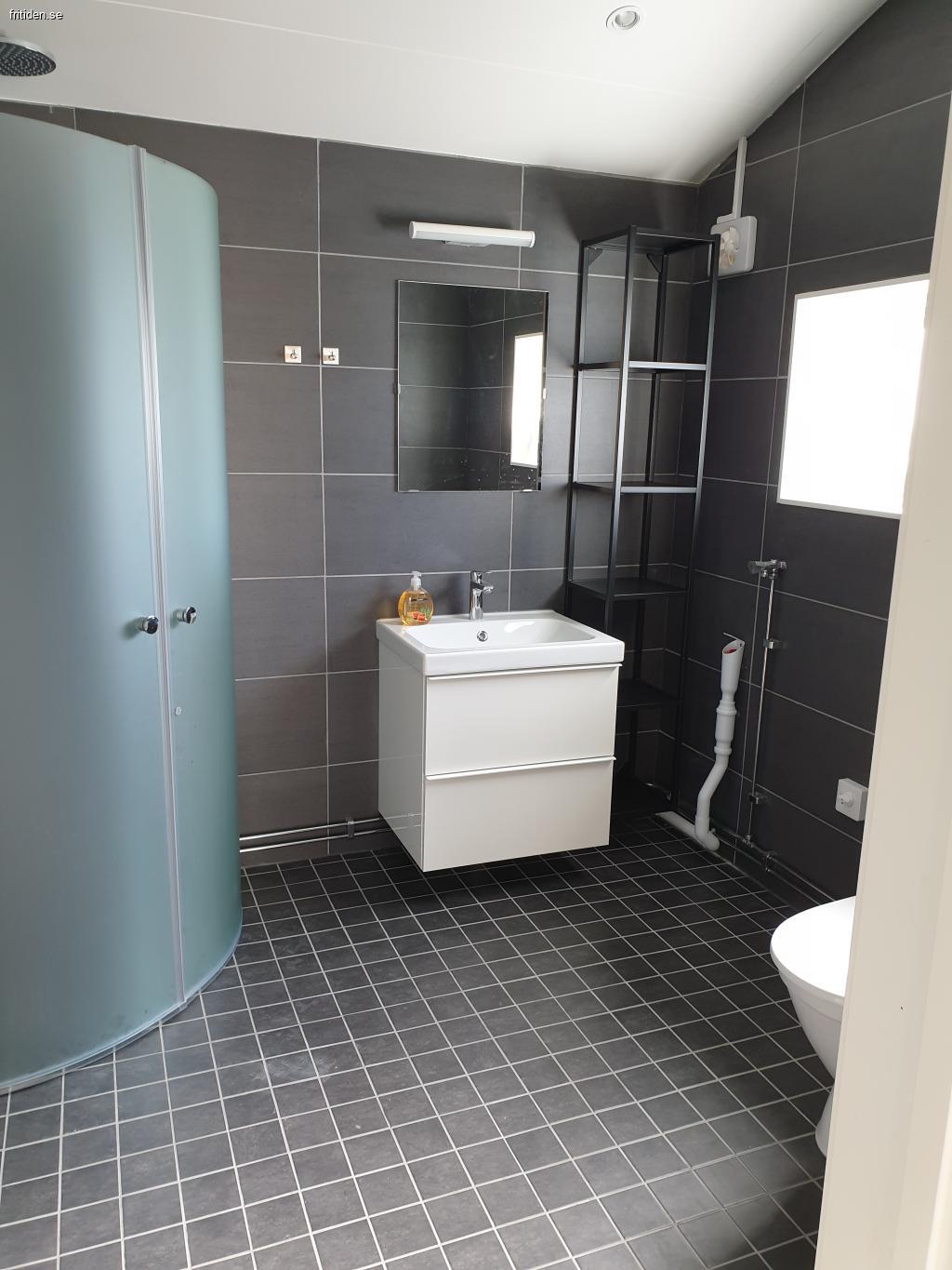 Stort badrum med dusch och wc.