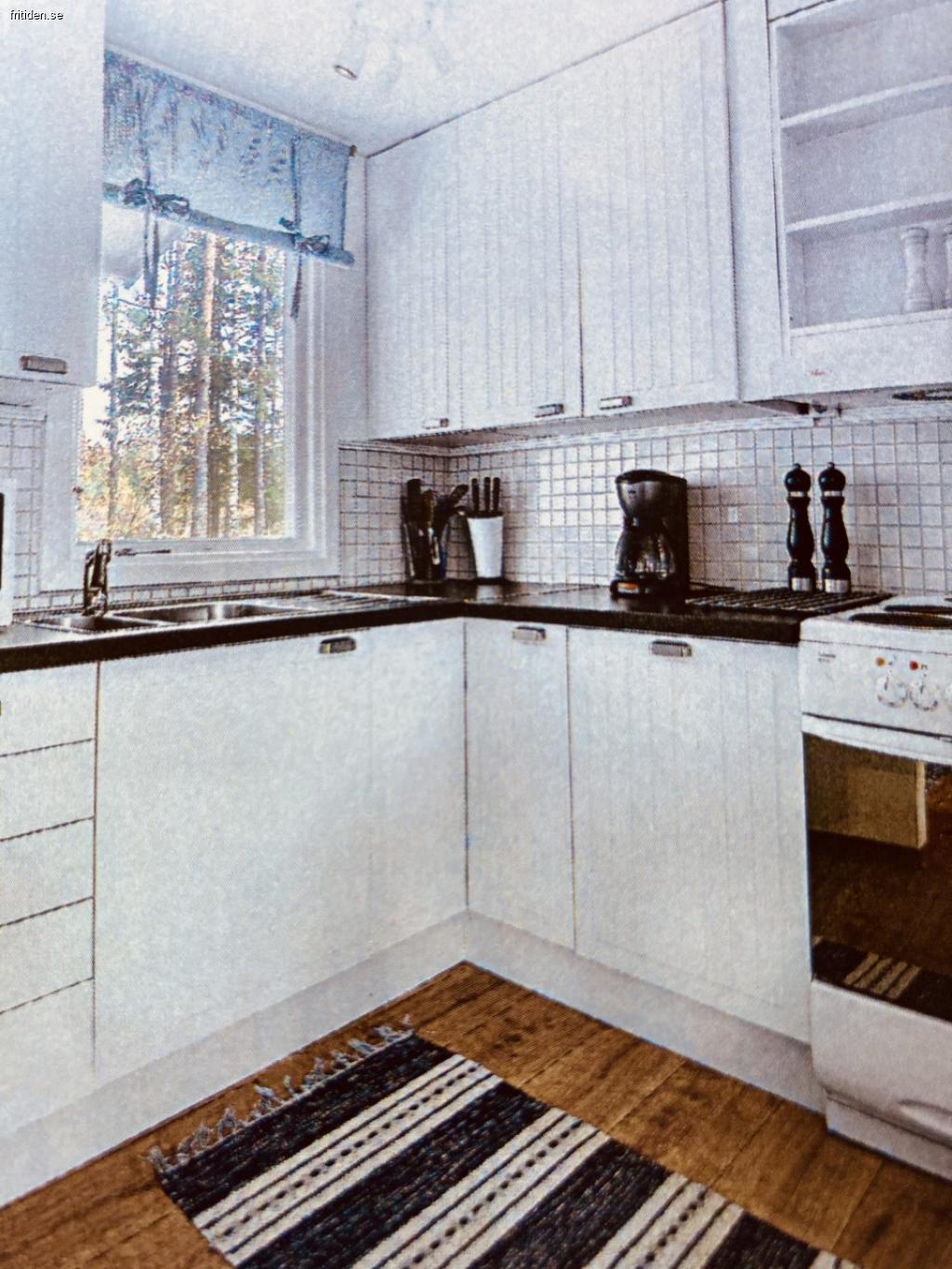 När du går runt huset kommer du till en rejäl trätrappa som leder in i stugan och möts av en rymlig hall med god förvaring. Till vänster har du det lilla köket men som ändå rymmer allt man behöver. Det finns även en extra kyl och frys i förrådet. Till höger är badrummet med toalett och dusch.