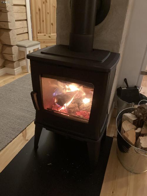 * Braskamin med glas så du ser elden tillsammans med vyn över sjön