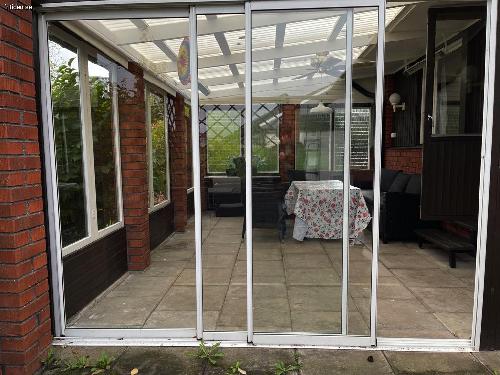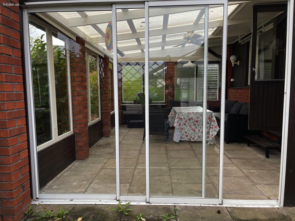 Huset har ett inglasat uterum och en uteplats som båda vetter mot trädgården.