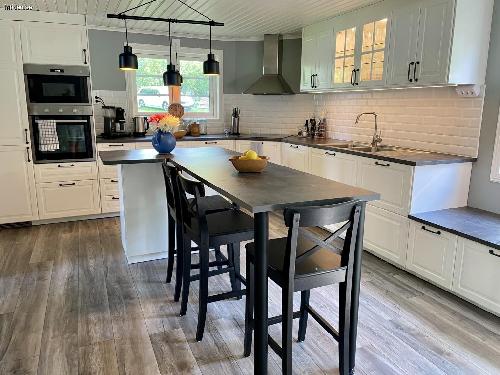 Arnäs, Moholm. 6+2 sängplatser. Två egna bryggor, grillplats, uteplatser, diskmaskin, tvättmaskin, wc, dusch, öppen spis, grill. Det finns bara en toalett/badrum.