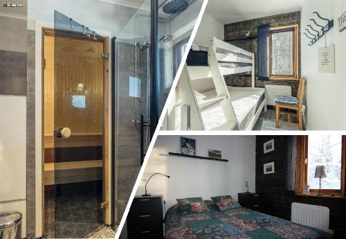 Ett sovrum med dubbelsäng. Ett sovrum med våningssäng, 2+1. Bäddsoffa i vardagsrummet. Barnsäng och barnstol.