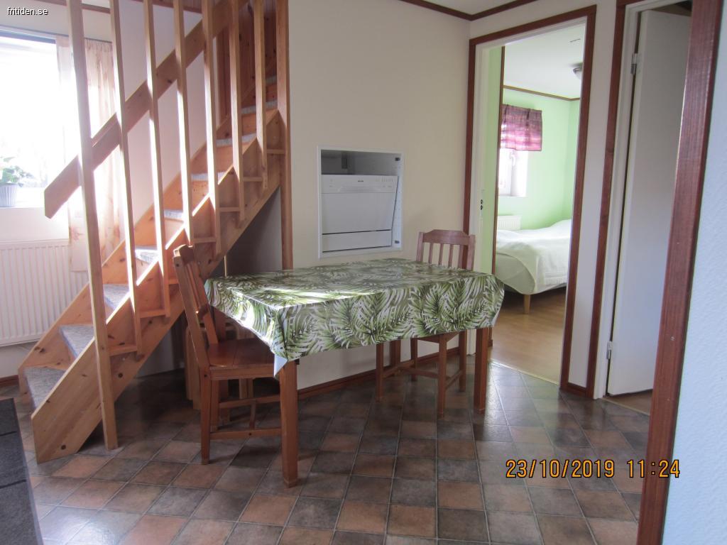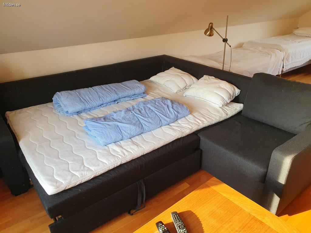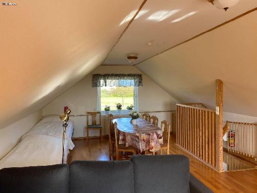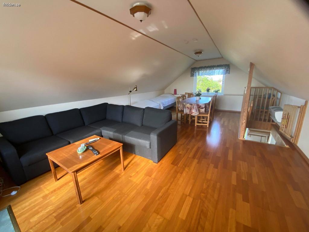 Övervåning: Stort härlig allrum, bäddsoffa för 2 st, tv, stort matbord, samt två sängar.