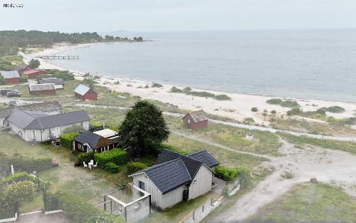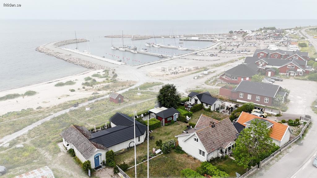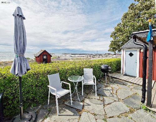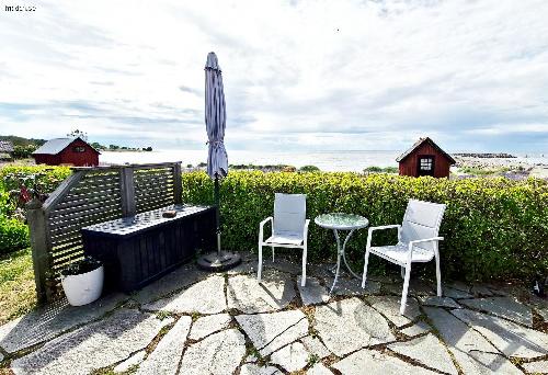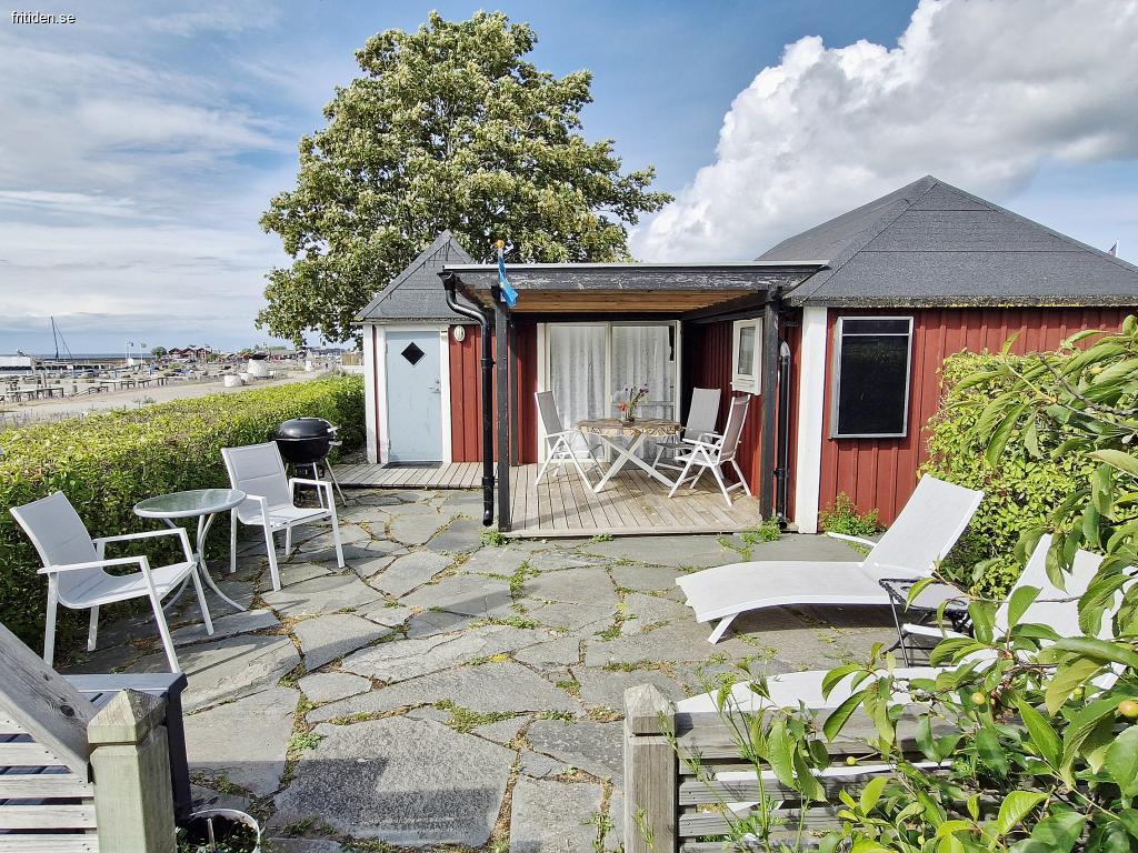 Terrass i västerläge komplett med trädgårdsmöbler, solstolar, dynbox, parasoll samt grill. Endast ca 50 m till badstrand. Njut av att sitta på terrassen och se de fantastiska solnedgångarna eller titta på båtlivet i hamnen.