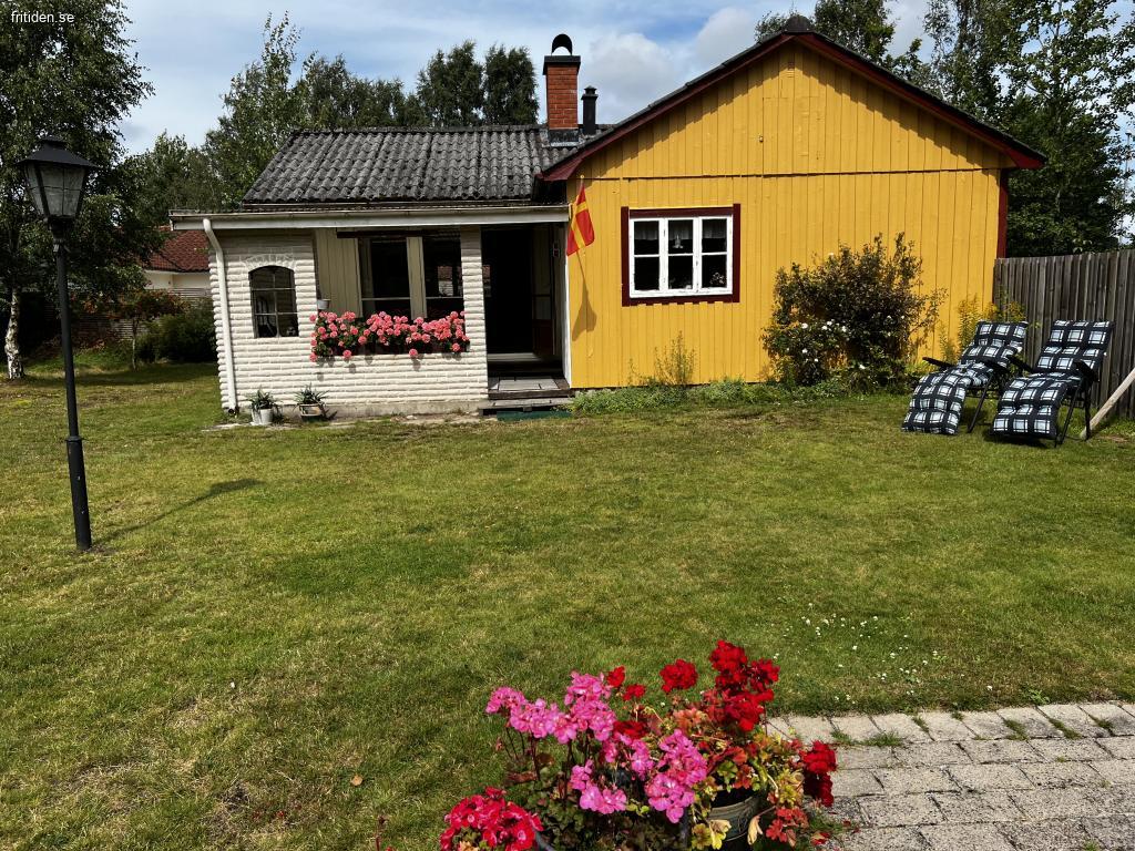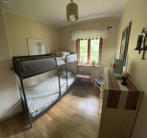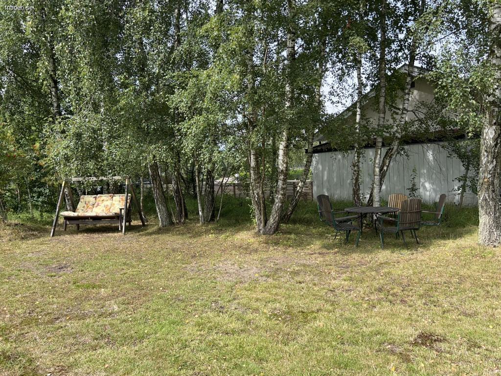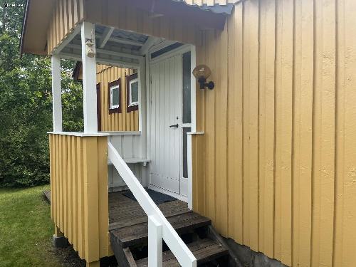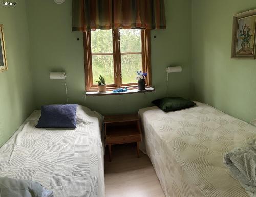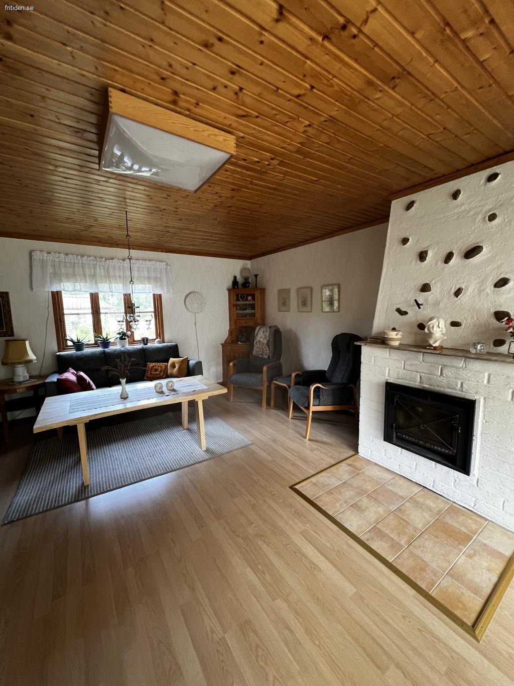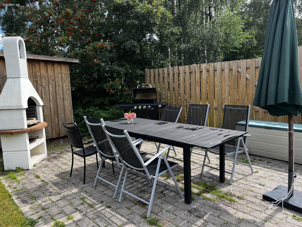 Stuga på stor insynsskyddad tomt, 1300 kvm. Flera uteplatser med möbler, en under tak. Här har ni en avskild plats att njuta i solen eller i skydd av träden. Det finns både gasolgrill och kolgrill tillgängliga vid den ena uteplatsen. Gunga för barnen och stora ytor för olika typer av spel och aktiviteter på gräsmattan. Inomhus är det tre separata sovrum där ett rum har en dubbelsäng, ett med en himmel säng och det tredje med två enkelsängar. Badrum med dusch. Välutrustat kök med matbord. Rymligt allrum med braskamin och TV.