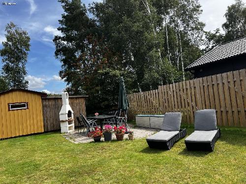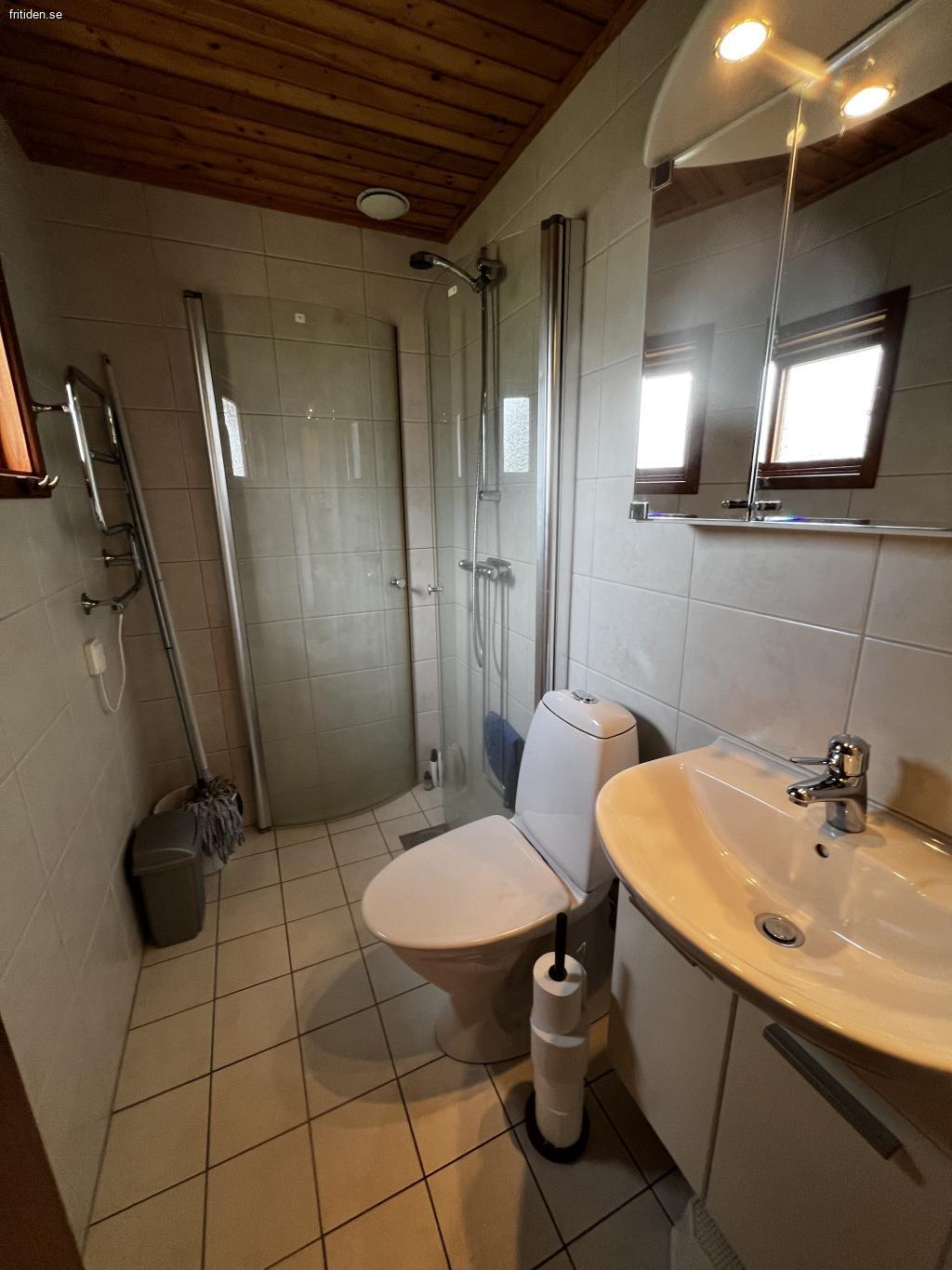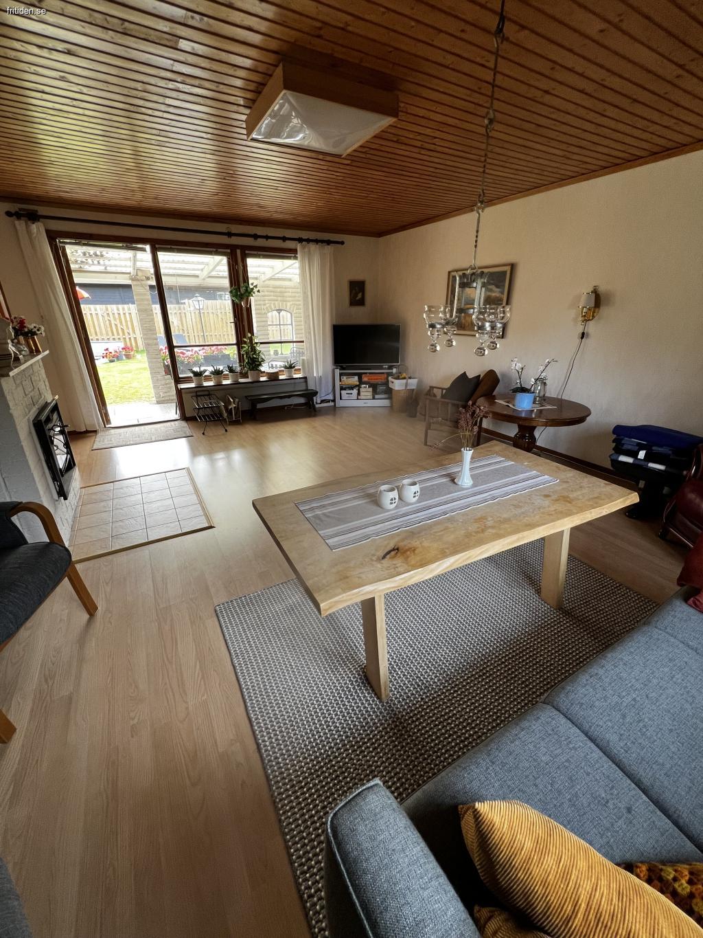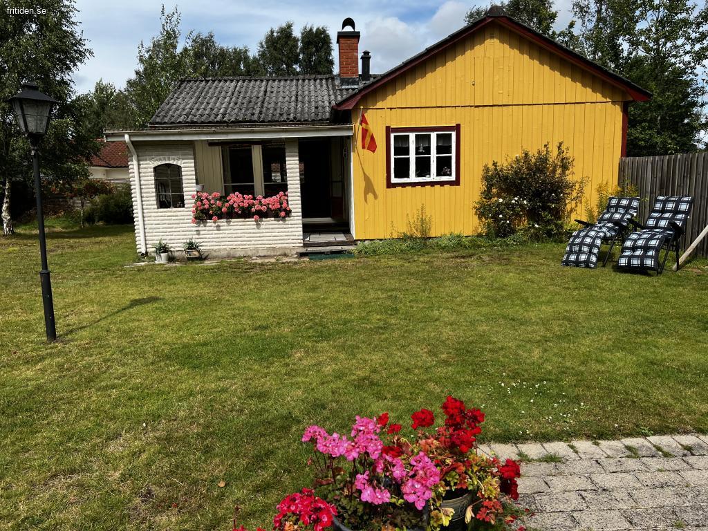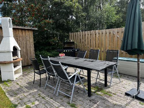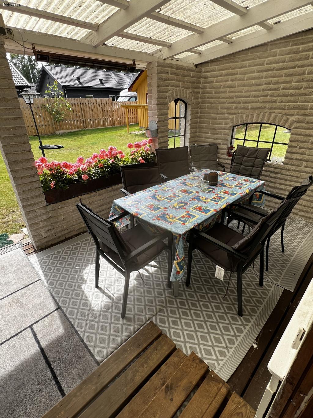 Stuga på stor insynsskyddad tomt, 1300 kvm. Flera uteplatser med möbler, en under tak. Här har ni en avskild plats att njuta i solen eller i skydd av träden. Det finns både gasolgrill och kolgrill tillgängliga vid den ena uteplatsen. Gunga för barnen och stora ytor för olika typer av spel och aktiviteter på gräsmattan. Inomhus är det tre separata sovrum där ett rum har en dubbelsäng, ett med en himmel säng och det tredje med två enkelsängar. Badrum med dusch. Välutrustat kök med matbord. Rymligt allrum med braskamin och TV.