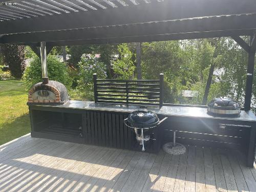 Fin trädgård och möblerad uteplats med pizzaugn och grill.