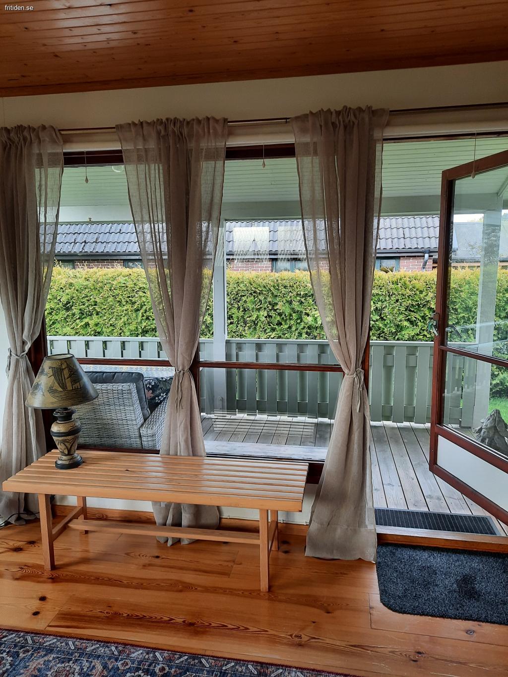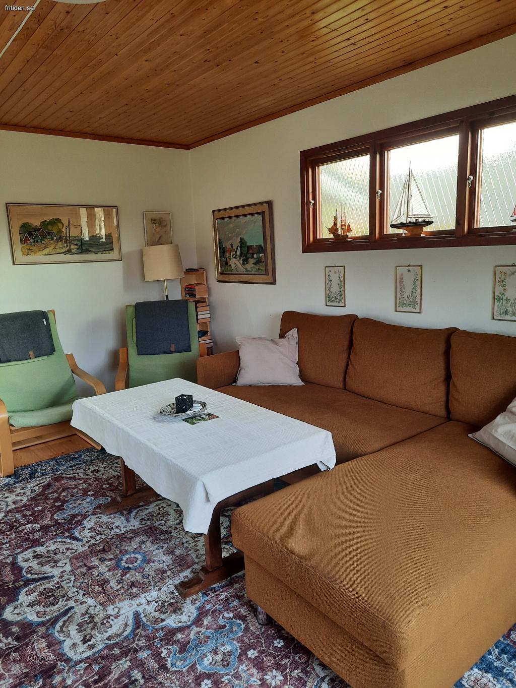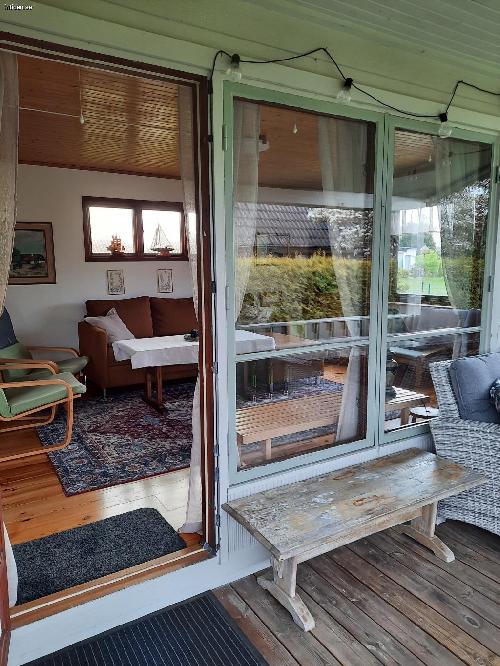 2 sovrum m. 5 sängar (inkl. 1 våningssäng), allrum m. TV och bäddsoffa, välutrustat kök m matplats. WC/dusch, tvättmaskin, WiFi, värmepump/AC, veranda m hörnsoffa och bord under tak, utomhusmöbler på gräsmatta. Nära till affär, hav och fin strand m brygga, golf, tennis, fotbollsplats m. lekplats