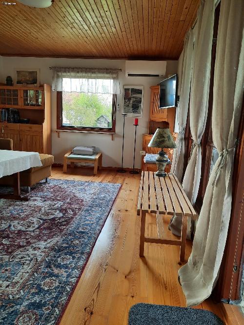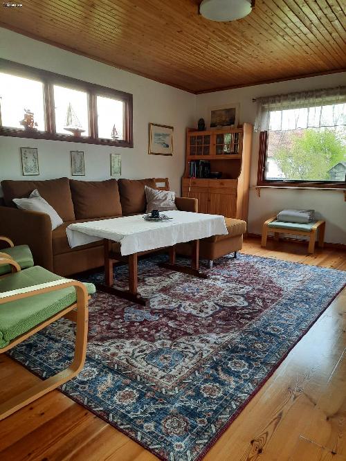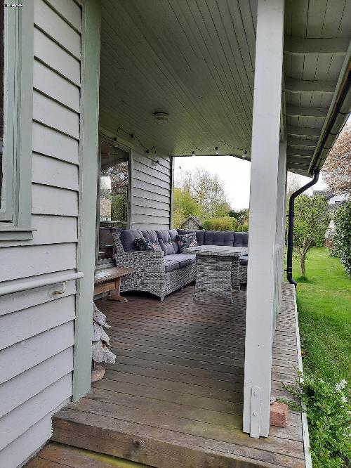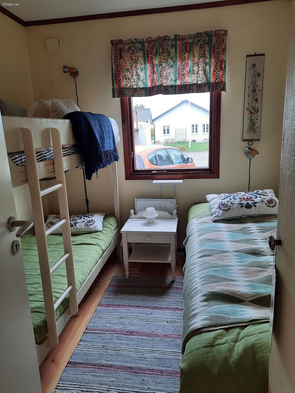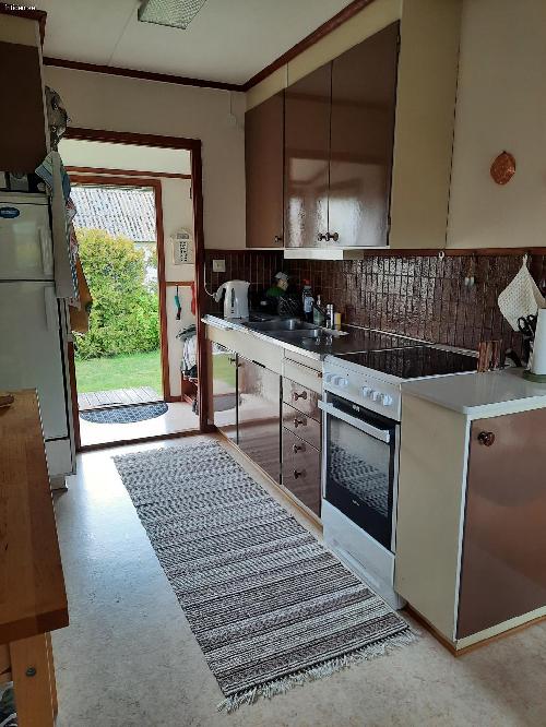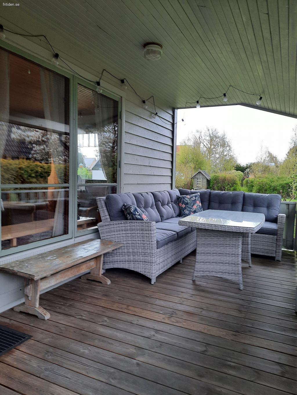 2 sovrum m. 5 sängar (inkl. 1 våningssäng), allrum m. TV och bäddsoffa, välutrustat kök m matplats. WC/dusch, tvättmaskin, WiFi, värmepump/AC, veranda m hörnsoffa och bord under tak, utomhusmöbler på gräsmatta. Nära till affär, hav och fin strand m brygga, golf, tennis, fotbollsplats m. lekplats