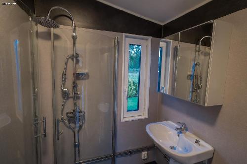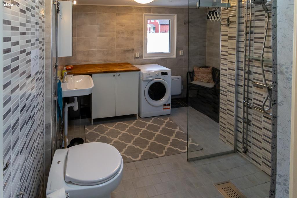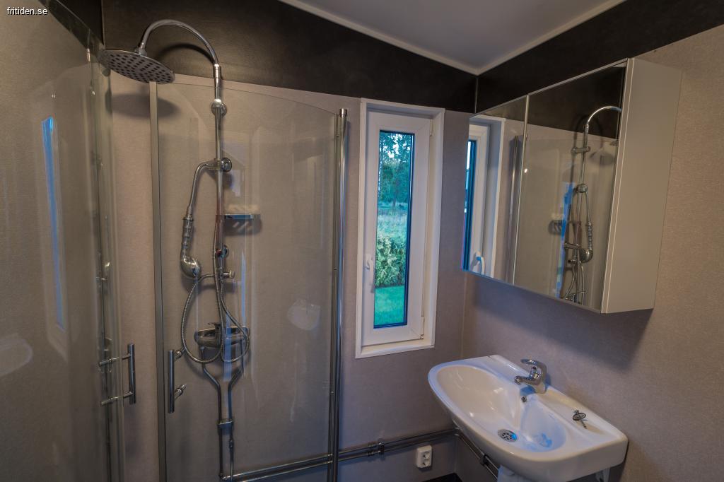 Helkaklat fullutrustat badrum med WC och skötbord. Gäststugan har kokvrå med dusch/varmvatten, toalett Separett Cindy förbränningstoalett och varmvattenberedare.