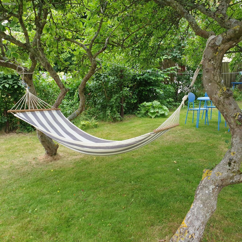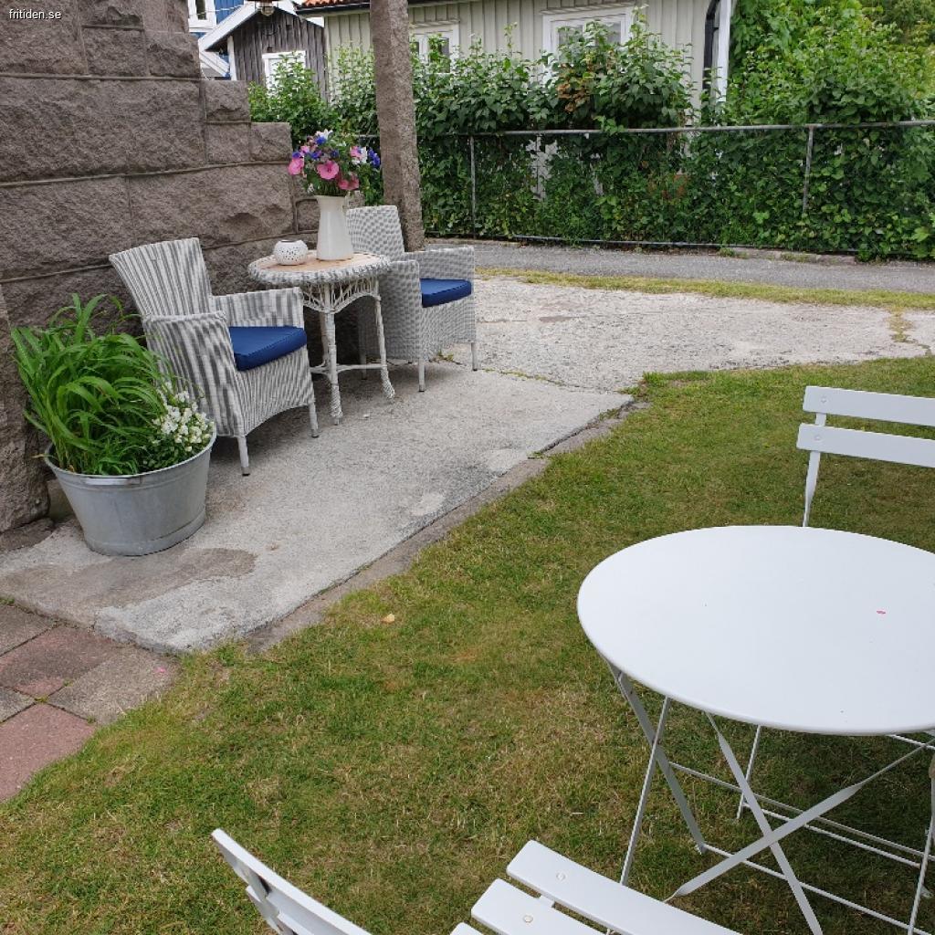 Stor trädgård med fruktträd, bärbuskar och med flera grupper av trädgårdsmöbler. Här kan Du finna lugnet och en stund för Dig själv i tex hängmattan mellan fruktträden. En oas mellan klipporna! Efter en solig dag på klipporna omfamnas Du av det gröna rummet och SKUGGA.