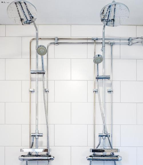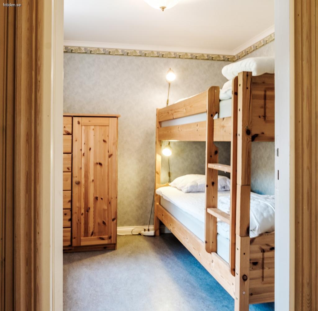 Övervåning med 4 sovrum, varav 2 har dubbelsäng och 2 har våningssäng, dusch/wc och bastu.