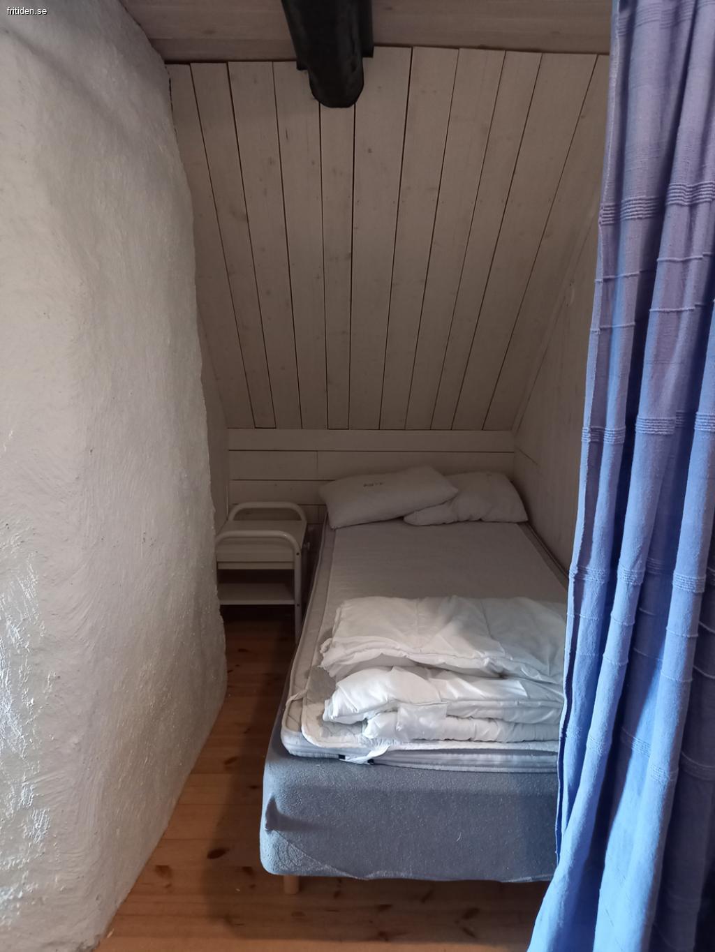 Ovanvåningen har vardagsrum med skinnsoffor, tv och Dvd. På hallen i ett litet utrymme står en 80 cm säng med sängbord och draperi som går att dra för. Sovrummet har dubbelsäng och en juniorsäng till barn.