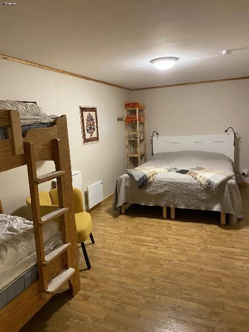 1 stort rum med 1 dubbelsäng och 1 våningssäng.