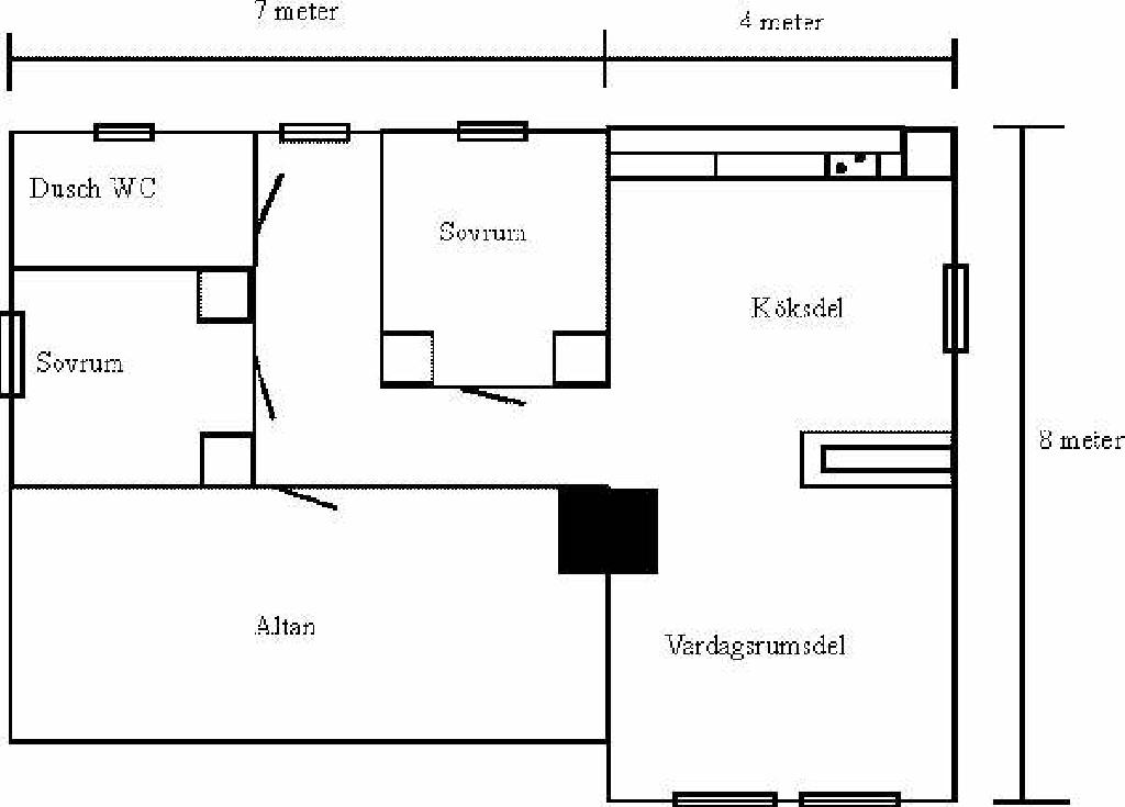 WC och dusch med kallt och varmt vatten. Två sovrum med vardera tvåbäddar per sovrum (ej våningssängar).