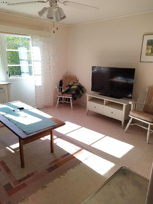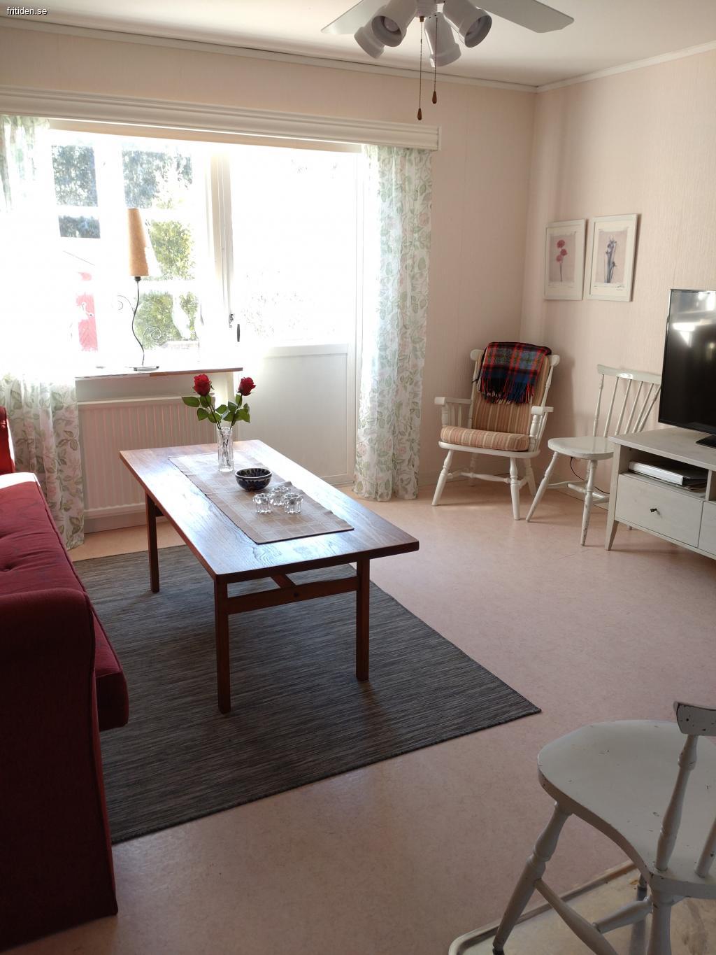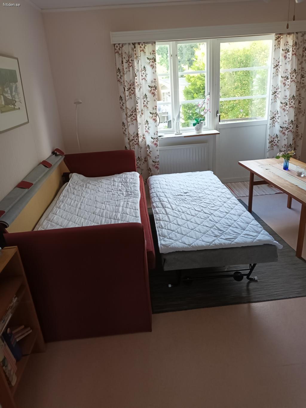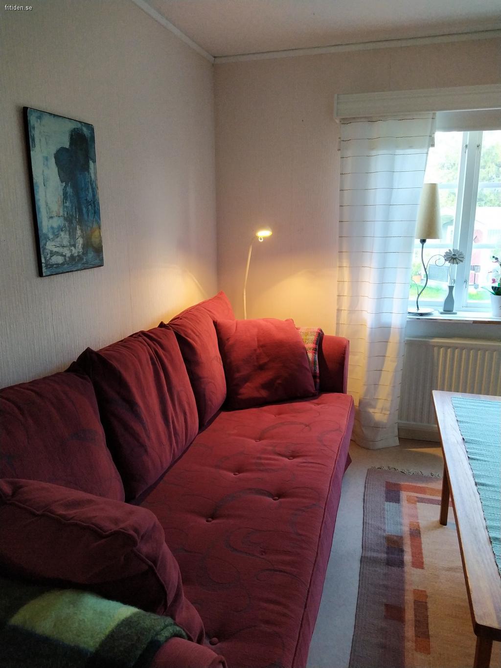 Två sängplatser nere i vardagsrummet i bäddsoffa. Litet mysigt kök med full utrustning, till säsongen 2022 har vi bytt ut den gamla spisen till en induktionshäll istället samt en fullstor ugn. TV med basutbud.