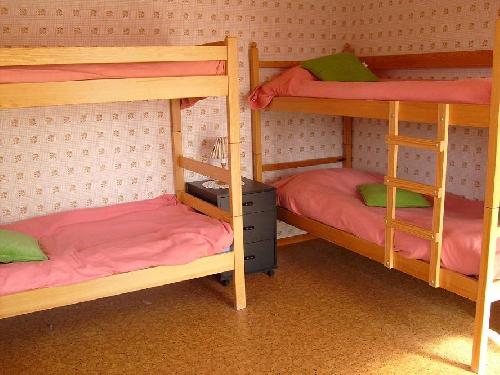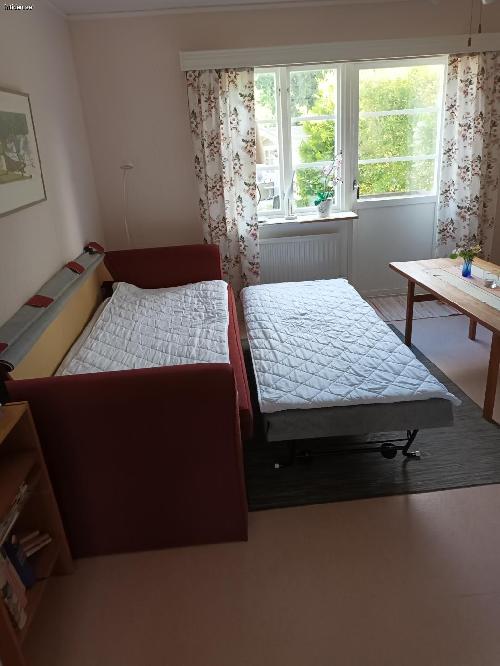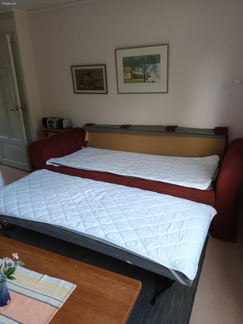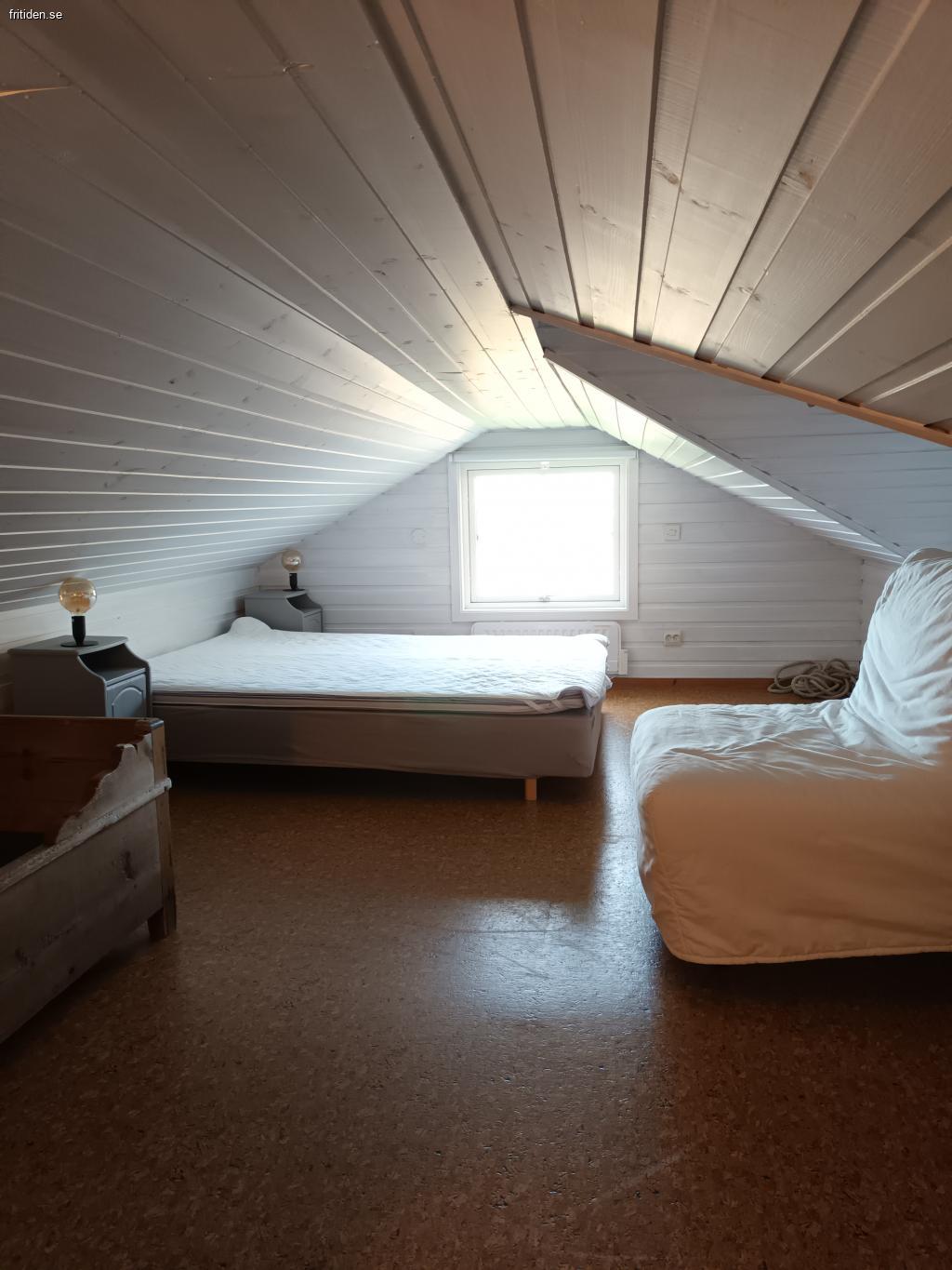 Låg takhöjd på övervåningen med dubbelsäng , en fäbosäng som är lite kort då den har stått där sedan huset byggdes samt en bäddfåtölj som passar barn/ungdomar.