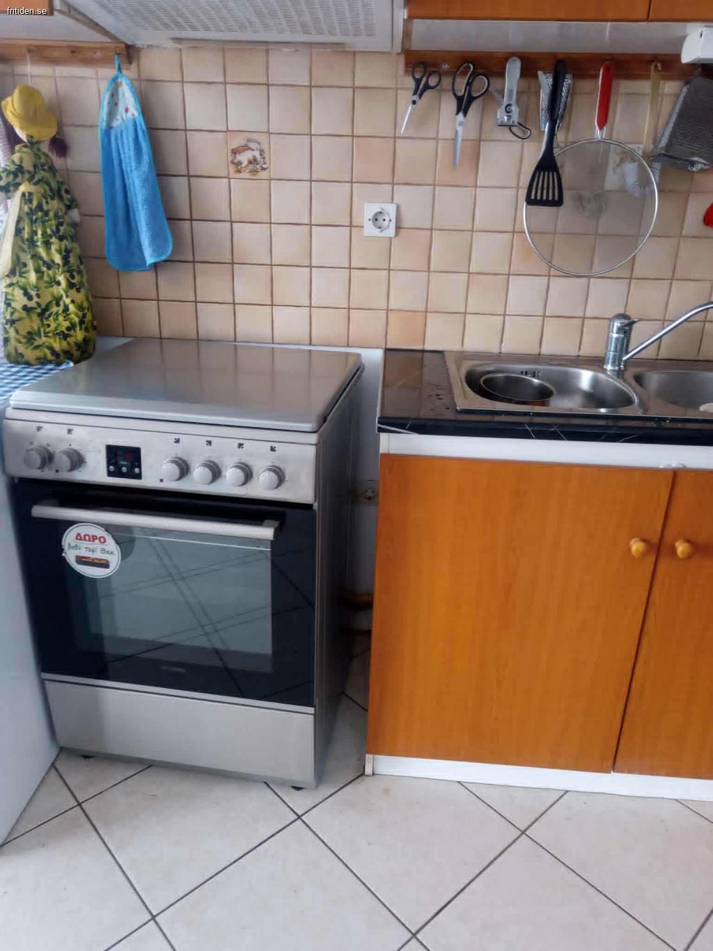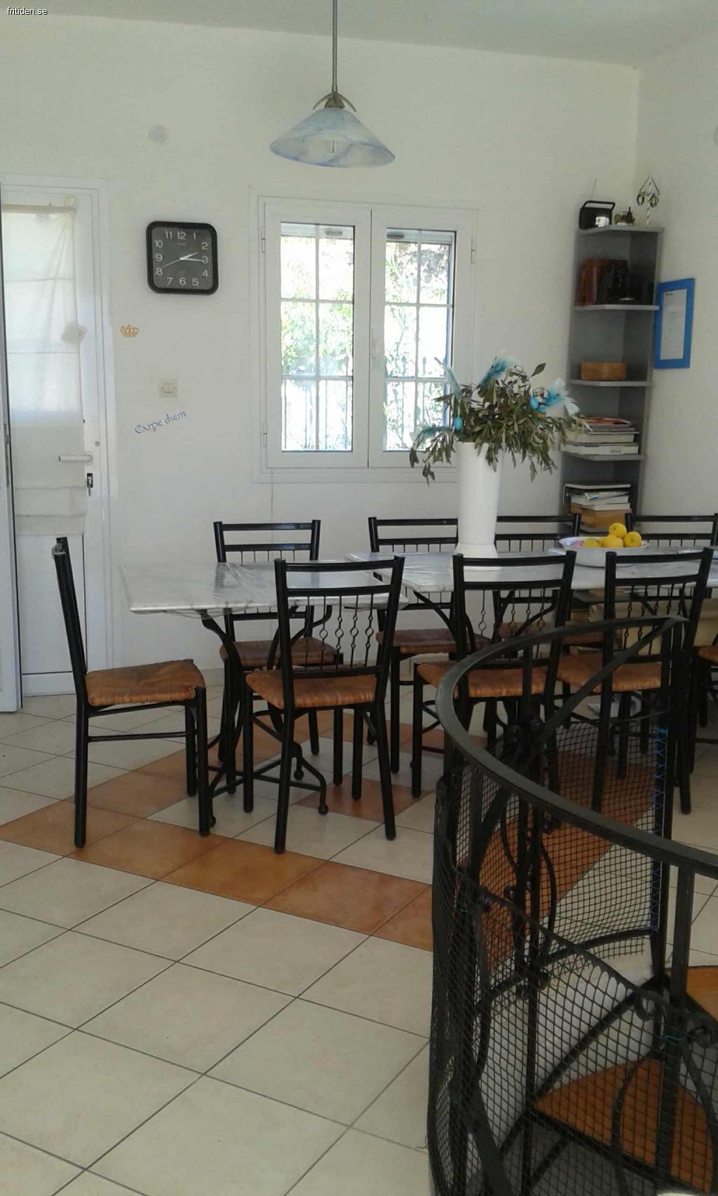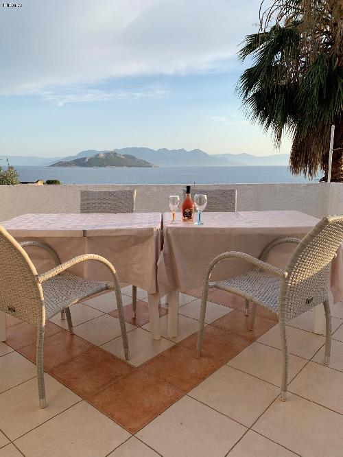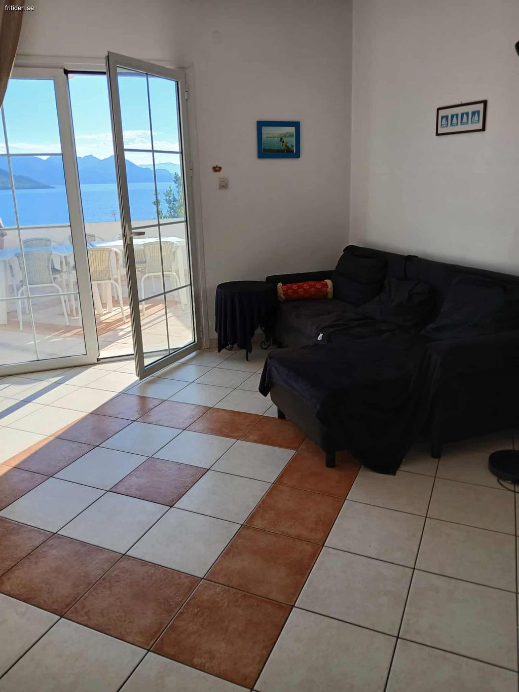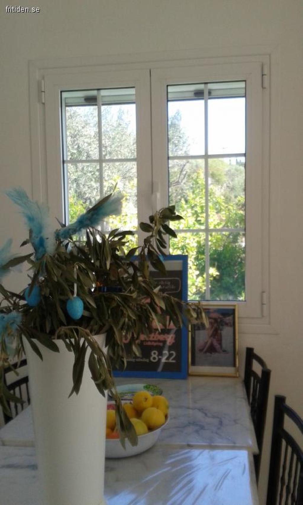 Det finns matbord i marmor, matstolar, en soffa med schäslong med soffbord, smarttv, och en öppen spis. Köket är fullt maskinellt utrustat med hällspis, kyl/frys, mikro, diskmaskin, vatten- och kaffekokare.Stora panorama fönster ut till terrassen erbjuder en magnifik havsutsikt inifrån kök/vardagsrum.