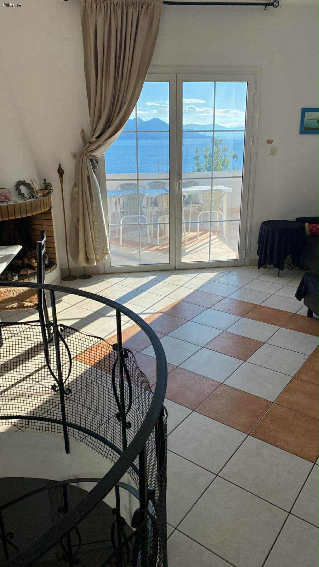 Utsikten är förtrollande över Saroniska bukten mot öarna Agistri och Moni, i bakgrunden ser man Peleponnessos. Det är ett friliggande vitrappat hus med blåa fönster luckor, alla väggar är vitkalkade, alla fönster och alla dörrar är vita. Detta ger en mycket ljus miljö. Nedre plan består av hall, tre sovrum och ett badrum.