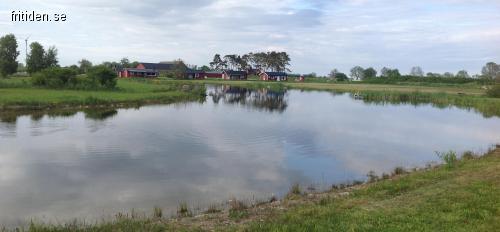 Stugan ligger i ett barnvänligt område med privat damm ,brygga med stege.