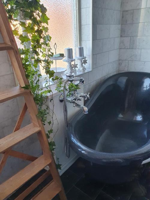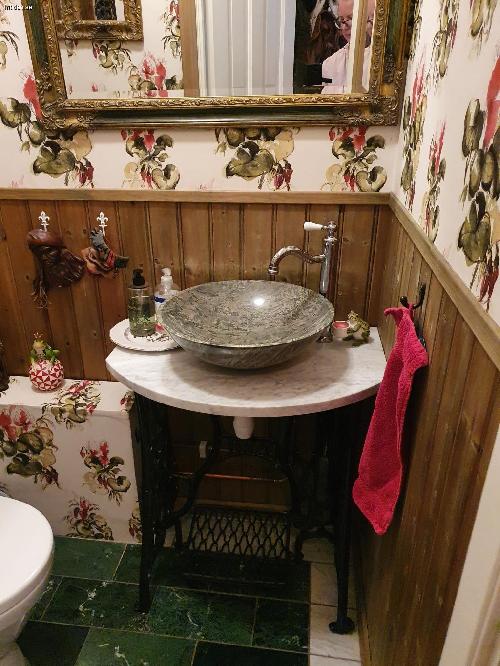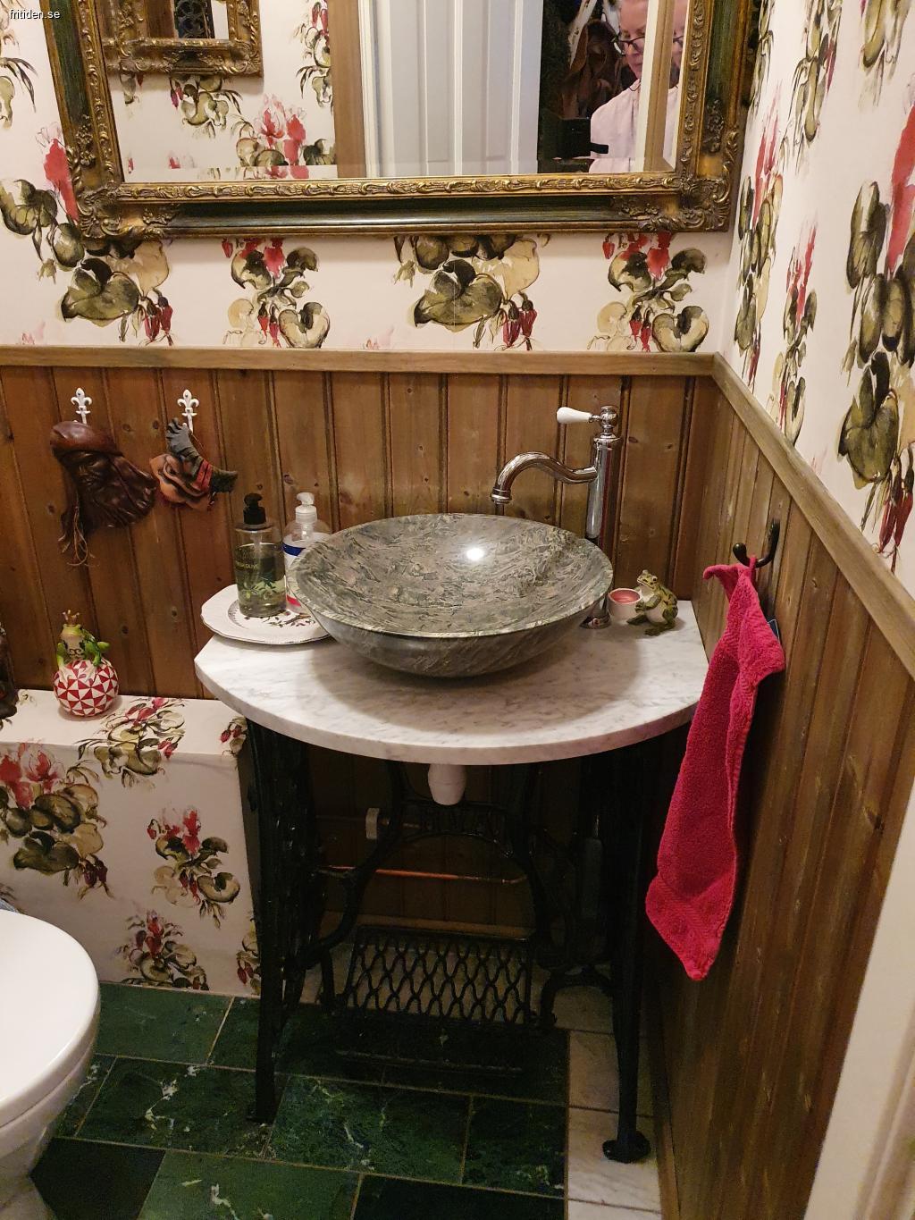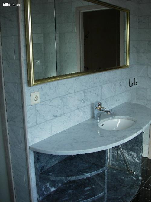 Fräscht badrum i sten och marmor samt en charmig gästtoalett.