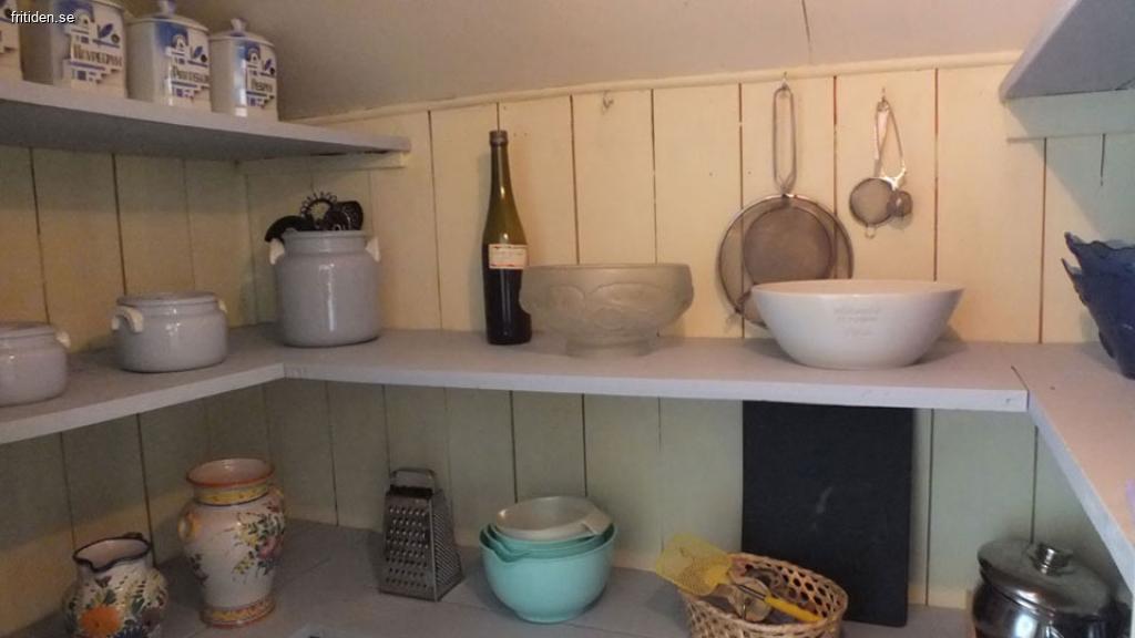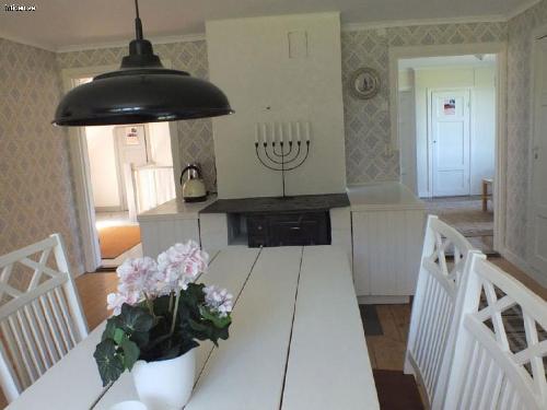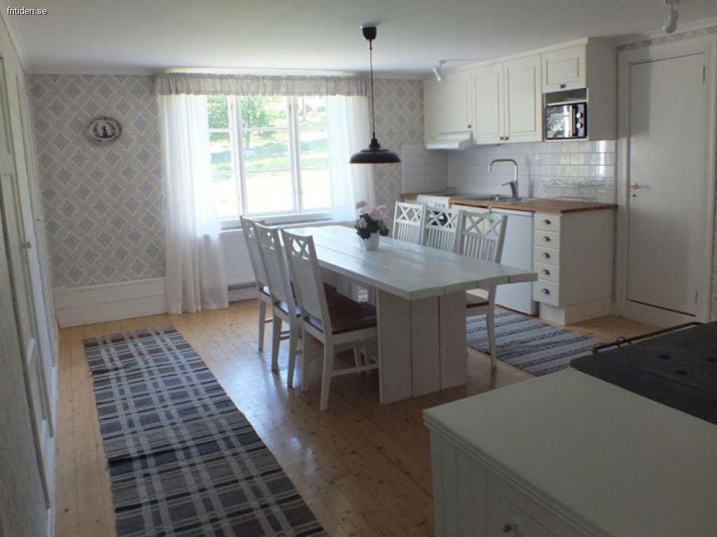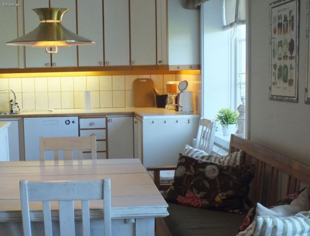 Stort lantligt kök med spis, kyl/frys, diskmaskin och sittplatser för 8 personer. Det finns också en vedkamin för mysiga vinterdagar.