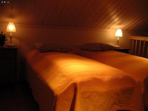 Exempel på utrustn: Tre sovrum/åtta bäddar, tre TV-apparater (storstuga, master bedroom, loft), WiFi/bredband/fiber, bastu, helkaklat badrum med värme i klinkergolvet m.m. Två toaletter, kyl/frys, disk- & tvättmaskin, torkskåp, braskamin, micro, matberedare, smörgåsjärn, våffeljärn, brödrost välutrustat kök, dvd-filmer, cd-skivor, läsvärda pocketböcker, sällskapsspel, pulkor/tefat för barnen mm