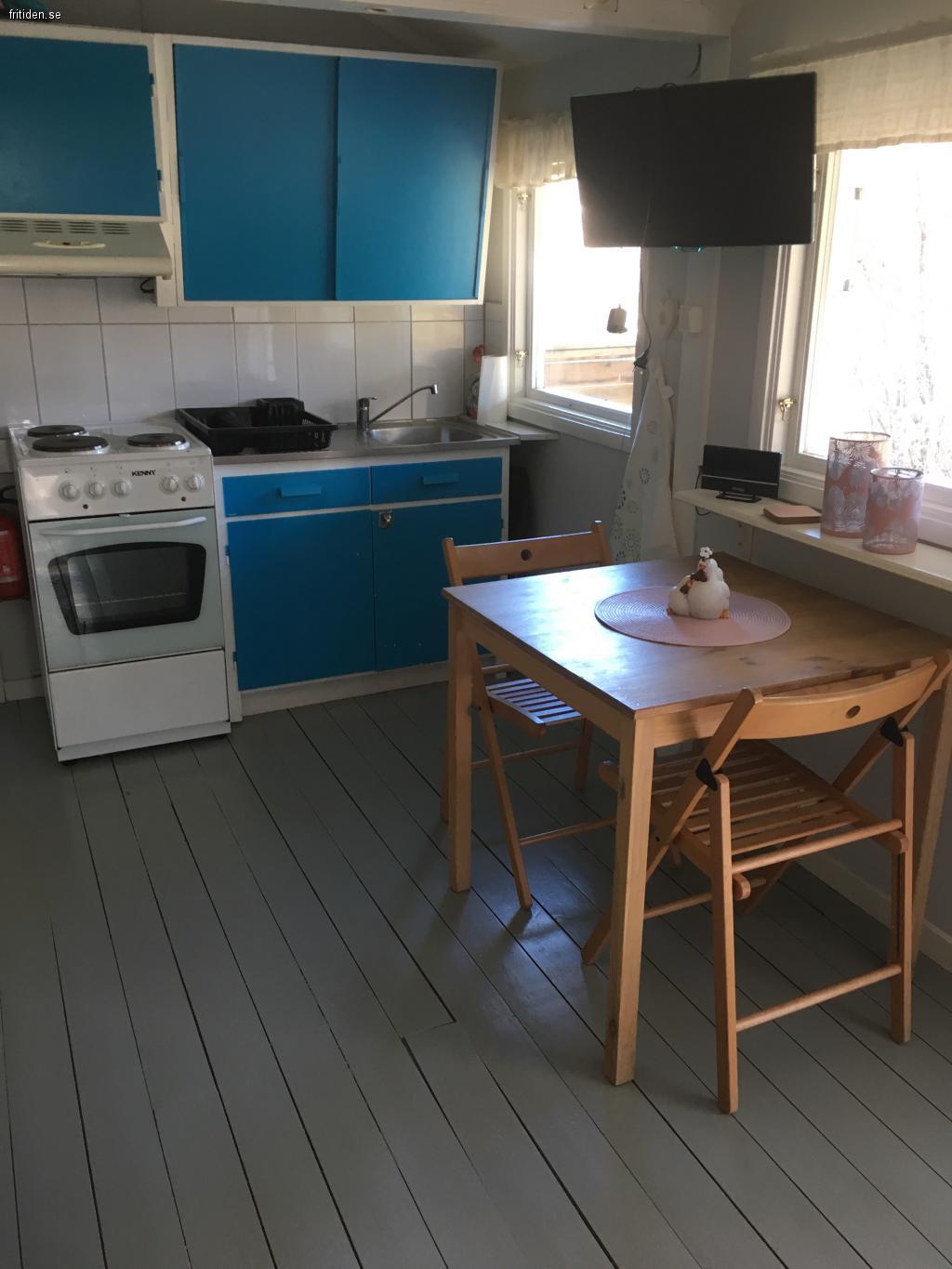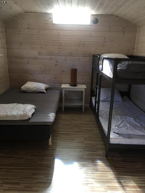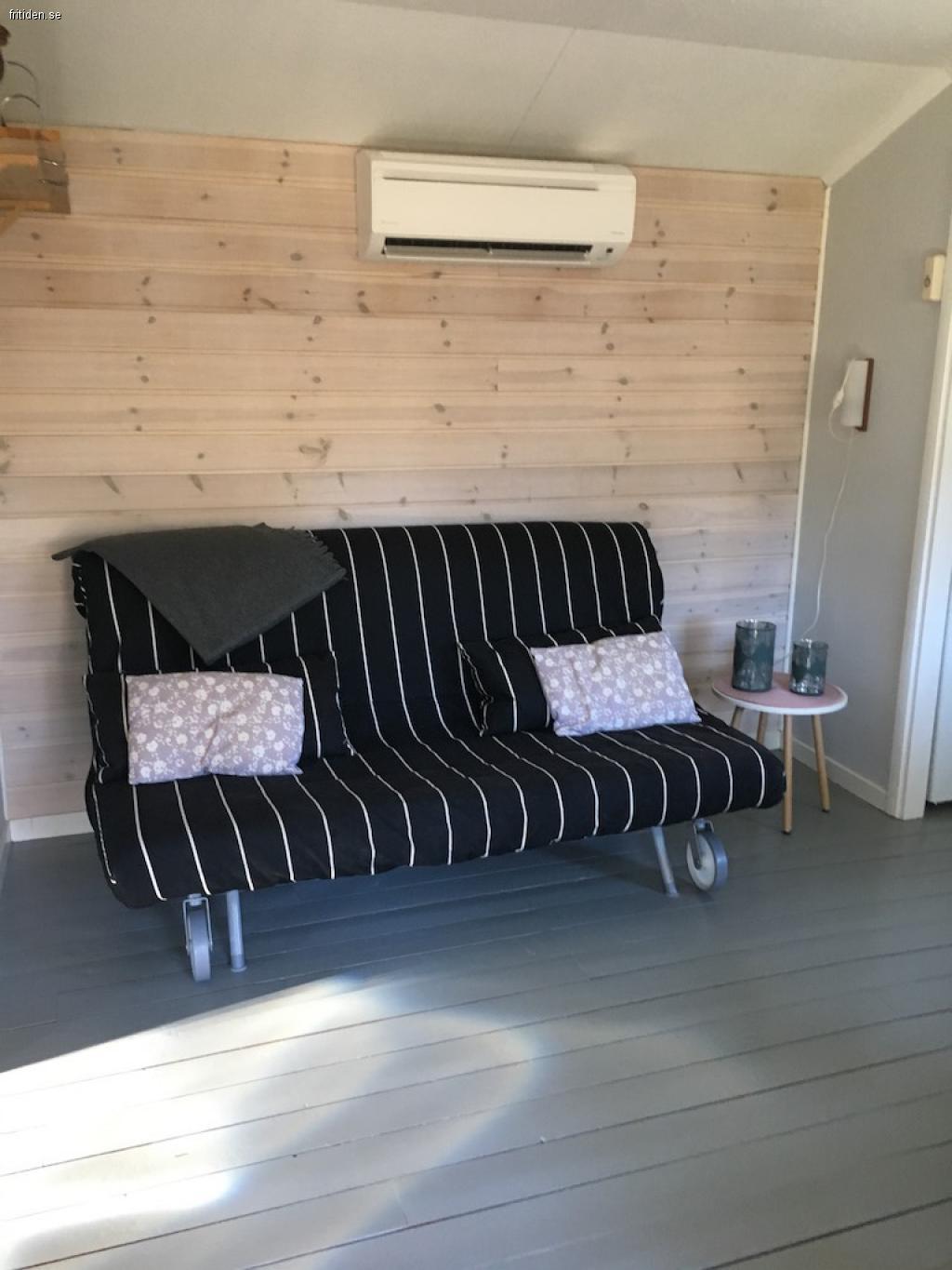 Stugan har 2 sängar i sovrummet varav en är våningssäng och den andra är 120cm bred, samt en bäddsoffa i allrummet där även matbord och tv finns. Litet fast fullt modernt kök med ugn/spis, micro, kyl/frys mm