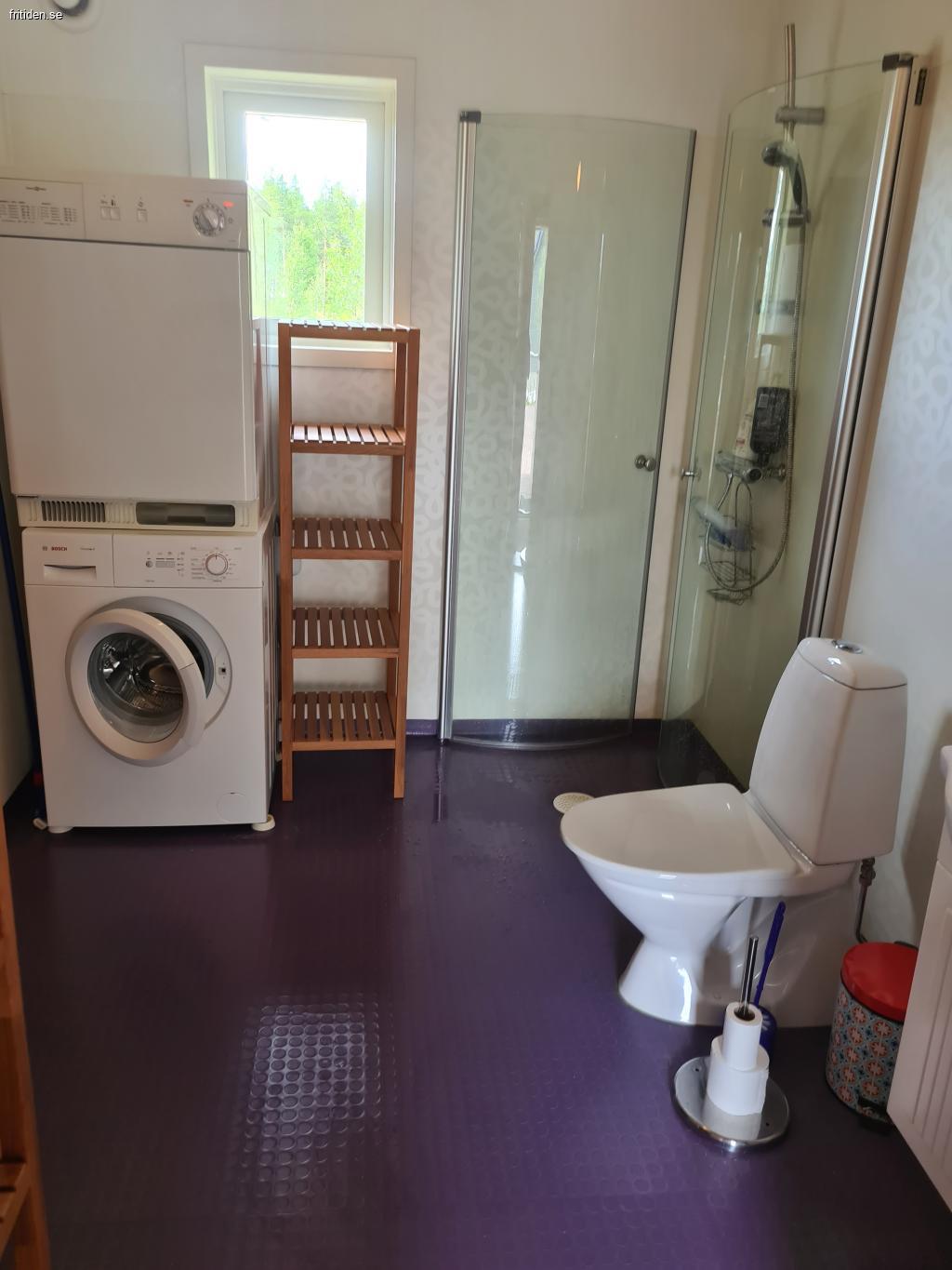 Stugan har ett fräscht badrum med dusch, toalett, handfat, tvättmaskin, torktumlare och bastu. Separat toalett med handfat.