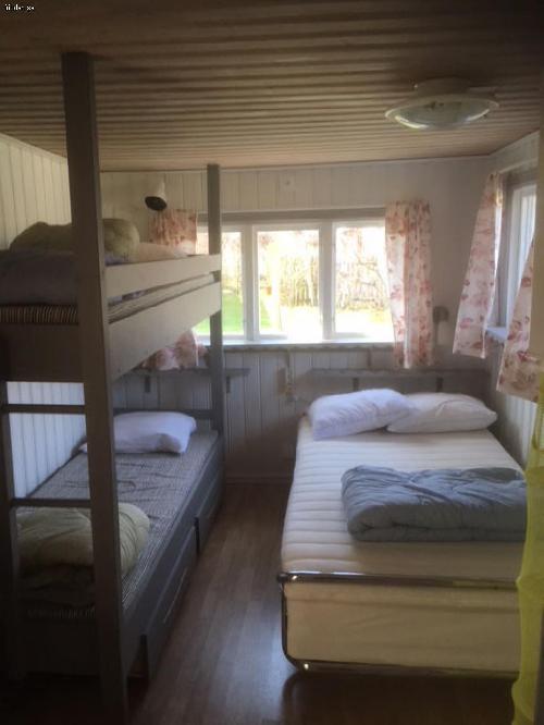 Ligger i stugområde med låång sandstrand. Barnvänligt. Nära campingplats. Lekstuga på tomten. Stugan har 1 sovrum med en extrabred vuxensäng + våningssäng m 2 bäddar, ett inglasat rum med bäddsoffa, möbler, Wifi finns, TV, sovloft med 2 madrasser direkt på golv. Pentry med all utrustning för 6 pers. Ugn, micro, kaffebrygg, 2 plattor, diskbänk, kylskåp m frysdel. Utemöbler på trädäck. Sällskapsdjur är välkomna! Toa o dusch.